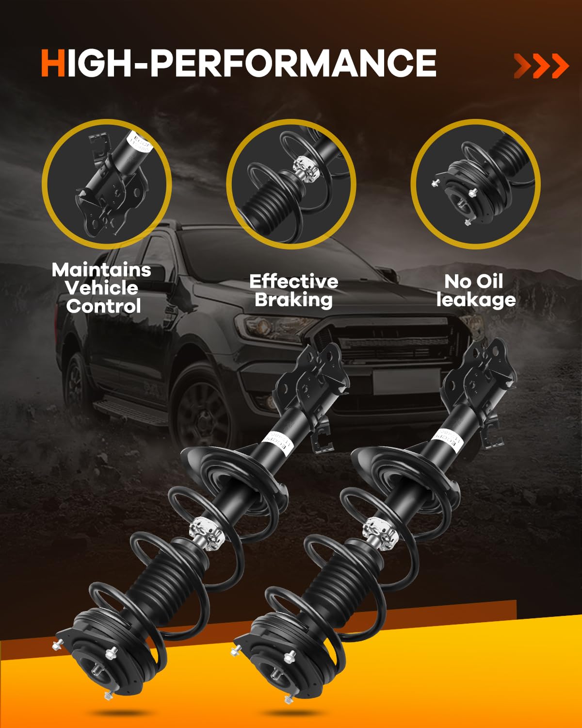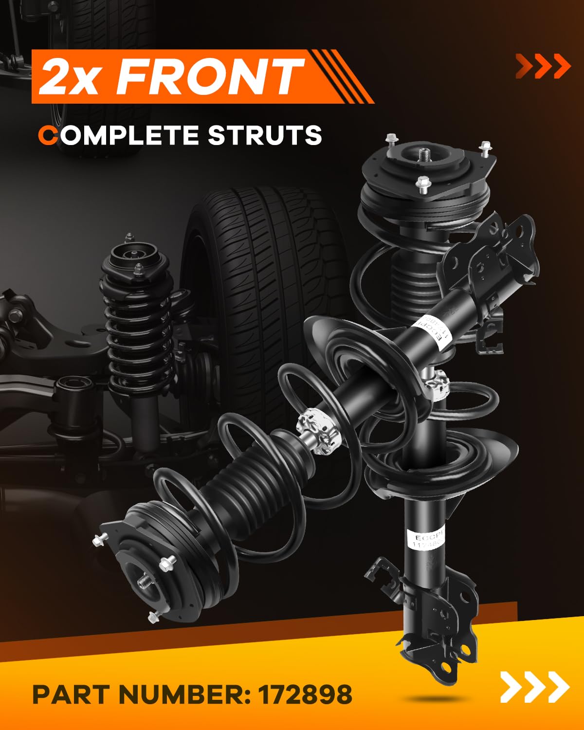 KIT INCLUDES: O kit inclui 2 amortecedores frontais completos com molas (esquerdo + direito). Cada amortecedor completo vem pré-montado com um strut, mola, suporte do strut, bota, kit de batente, assento da mola e isolador. A instalação não requer um compressor de mola, facilitando o processo.
