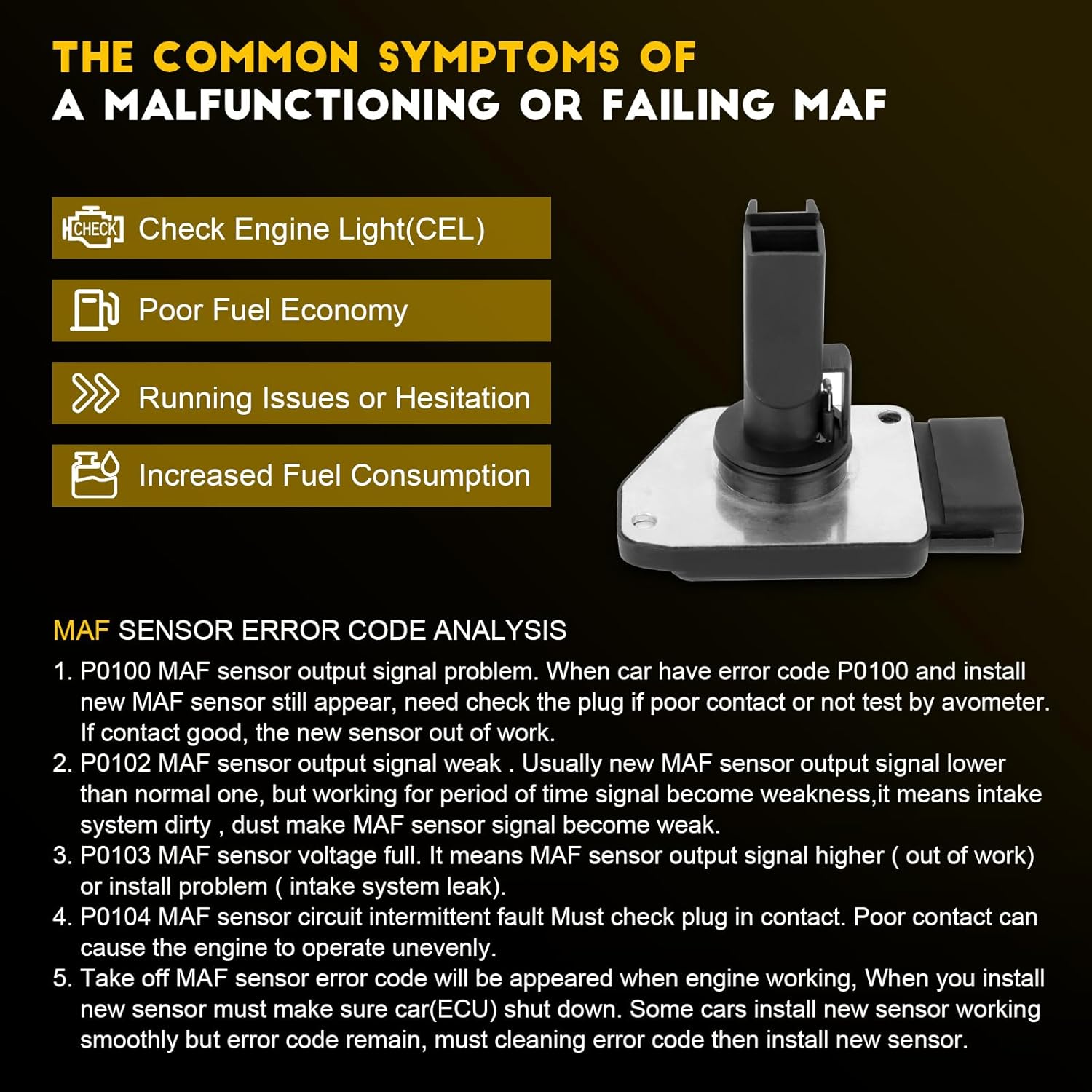 • NOTE: Antes de adquirir este MAF Meter, utilize a barra de seleção de ano/marca/modelo para confirmar a compatibilidade. É essencial limpar a caixa de ar e substituí-la antes de instalar o MAF Meter, caso contrário, o código e a luz de verificação do motor podem continuar a aparecer, mesmo após a substituição do sensor de fluxo de ar em massa.