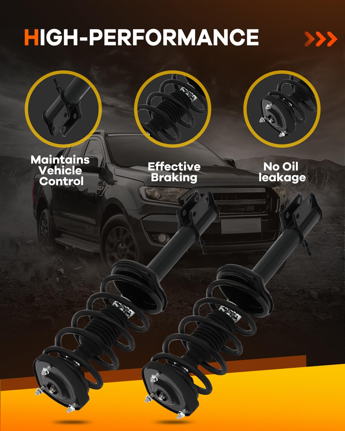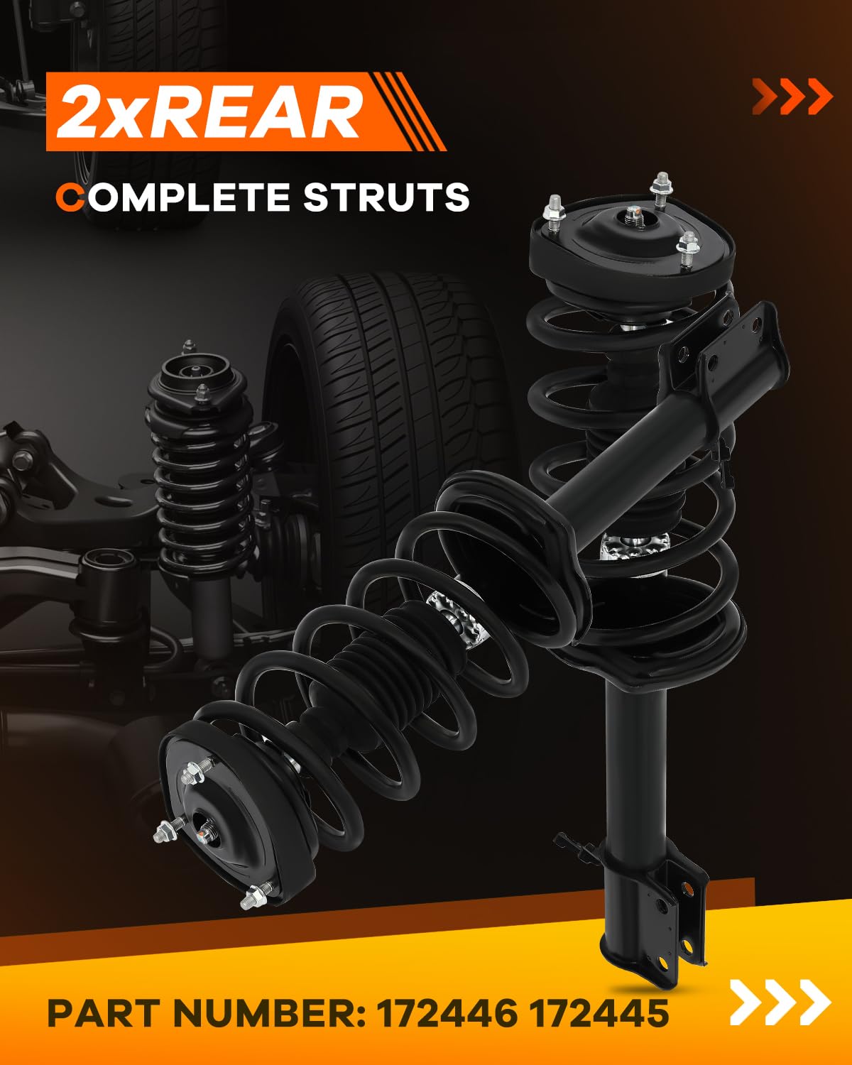 KIT INCLUDES: O kit inclui dois amortecedores traseiros completos com molas (esquerdo + direito). Cada strut vem pré-montado, incluindo o strut, mola, suporte do strut, bota, kit de batente, assento da mola e isolador. A instalação é facilitada, pois não é necessário um compressor de mola.