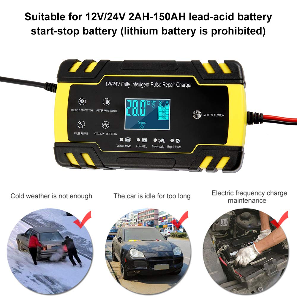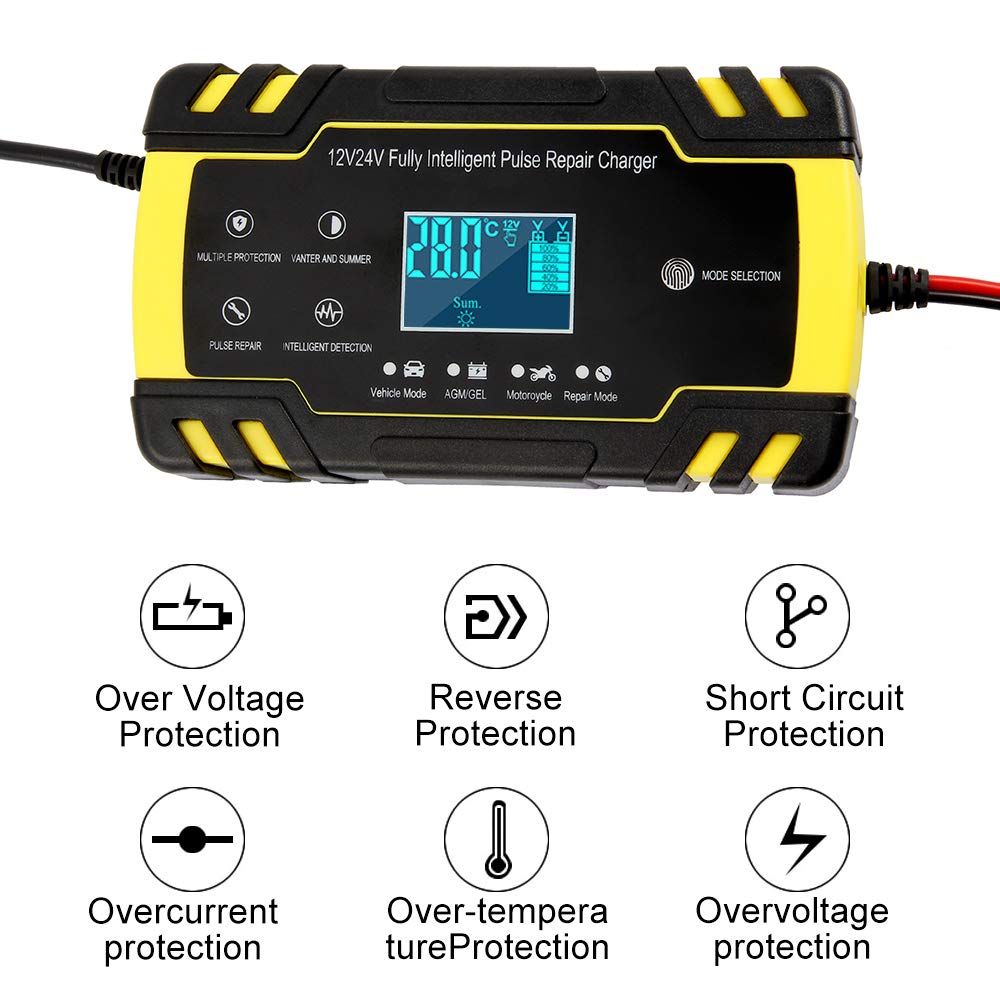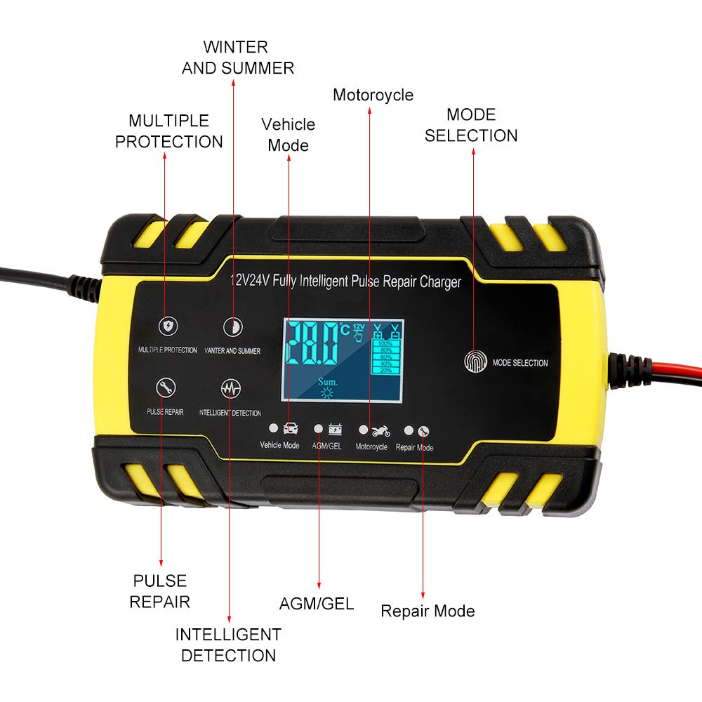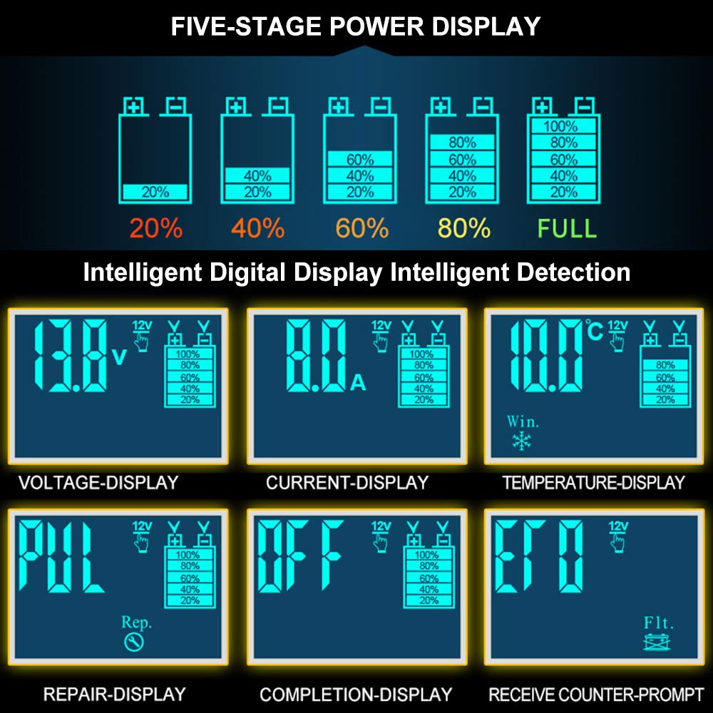 O ODOMY 12V/24V Smart Battery Charger é a solução definitiva para quem busca eficiência e segurança no carregamento de baterias. Com um design moderno e funcional, este carregador inteligente é equipado com a mais recente tecnologia de controle de CPU, que ajusta automaticamente a corrente de carga e a manutenção de acordo com a temperatura ambiente. Isso significa que, durante o inverno, o carregador opera em plena capacidade, enquanto no verão evita sobrecargas, garantindo a saúde da bateria em todas as estações.