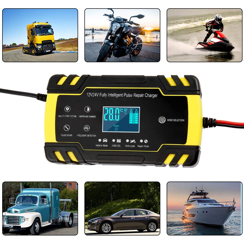 A compatibilidade do ODOMY é um dos seus grandes diferenciais. Ele é adequado para baterias de 12V e 24V, incluindo SLA, WET, MF, FLOODED, GEL, VRLA, AGM e EFB. Isso o torna ideal para uma ampla gama de veículos, como carros, caminhões, motocicletas, barcos e até cortadores de grama. O usuário pode selecionar modos específicos para carregar baterias de carros, caminhões ou baterias AGM, tornando-o uma ferramenta versátil para qualquer garagem.