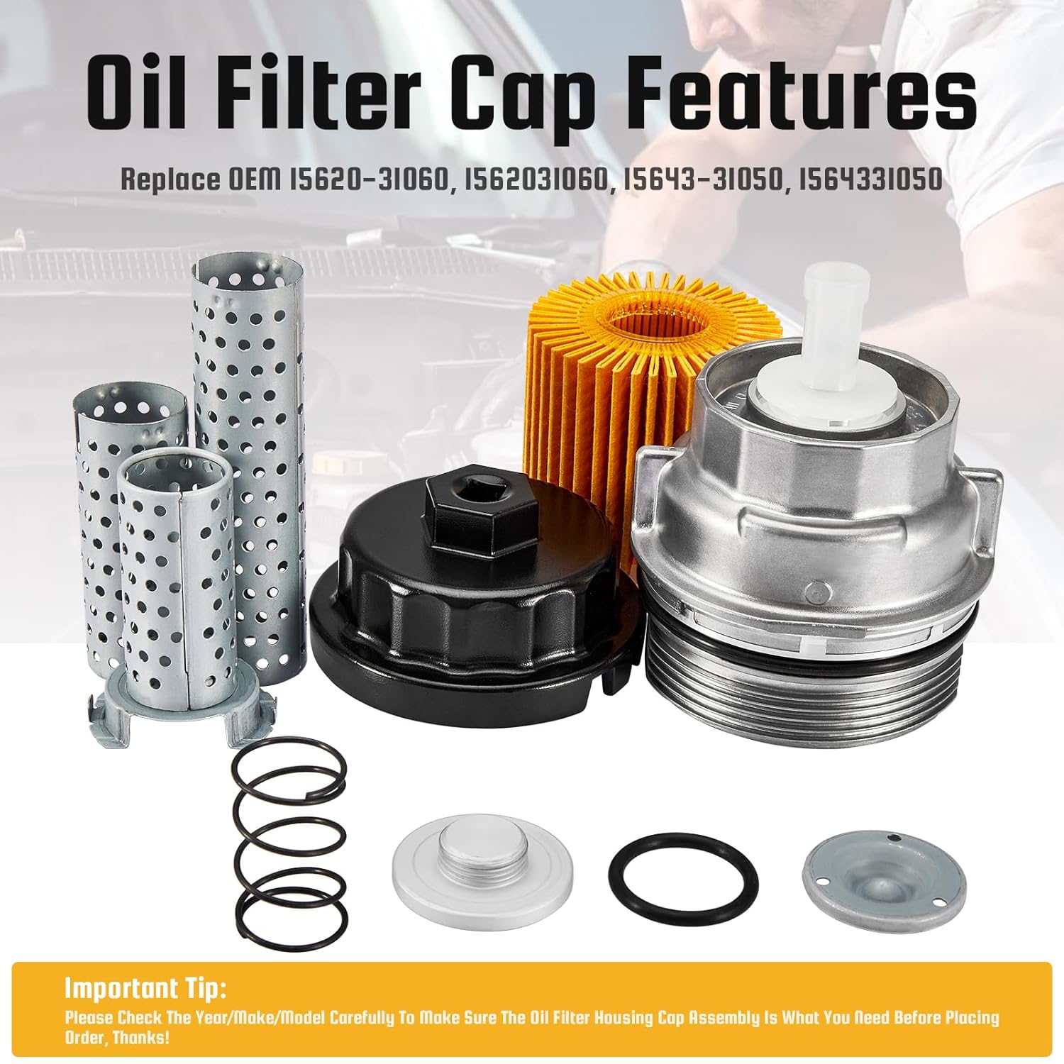 O Conjunto de Tampa do Cartucho do Filtro de Óleo 15620-31060 é a solução ideal para proprietários de veículos Toyota e Lexus entre 2005 e 2019, incluindo modelos como Tundra, RAV4, 4Runner, Camry, Highlander, Tacoma, Avalon, Sienna, Venza e RX350. Este produto foi desenvolvido com materiais de alta qualidade, garantindo durabilidade e confiabilidade excepcionais. A tampa do filtro de óleo é fabricada em alumínio premium, que passa por rigorosos testes antes do envio, atendendo aos padrões OEM.