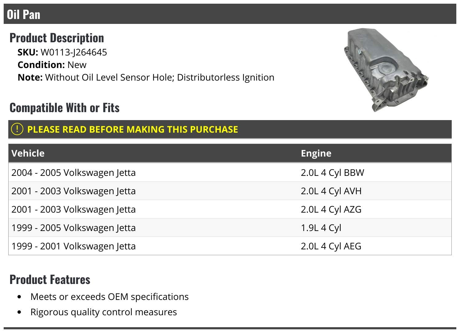 O cárter de óleo (sem furo para sensor de nível de óleo) é uma peça essencial para o funcionamento adequado do motor do Volkswagen Jetta, compatível com os modelos de 1999 a 2005, equipados com motores 1.9L e 2.0L de 4 cilindros, que utilizam ignição sem distribuidor. Este cárter foi projetado para atender e até superar as especificações OEM, garantindo que seu veículo mantenha um desempenho ideal e confiável.