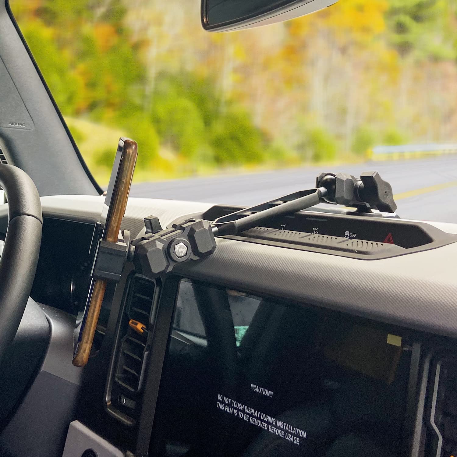 Com uma largura de 2,55″ a 7,6″ e altura de 5,3″ a 7,6″, o suporte é compatível com a maioria dos modelos de smartphones, incluindo iPhone XS Max, XS, XR, X, 8, Galaxy S10, S9, Note 9, 8, 5, entre outros. O Suporte para Celular OMU Bronco é um acessório indispensável para quem possui um Ford Bronco 2021-2022, disponível para versões de 2 e 4 portas.