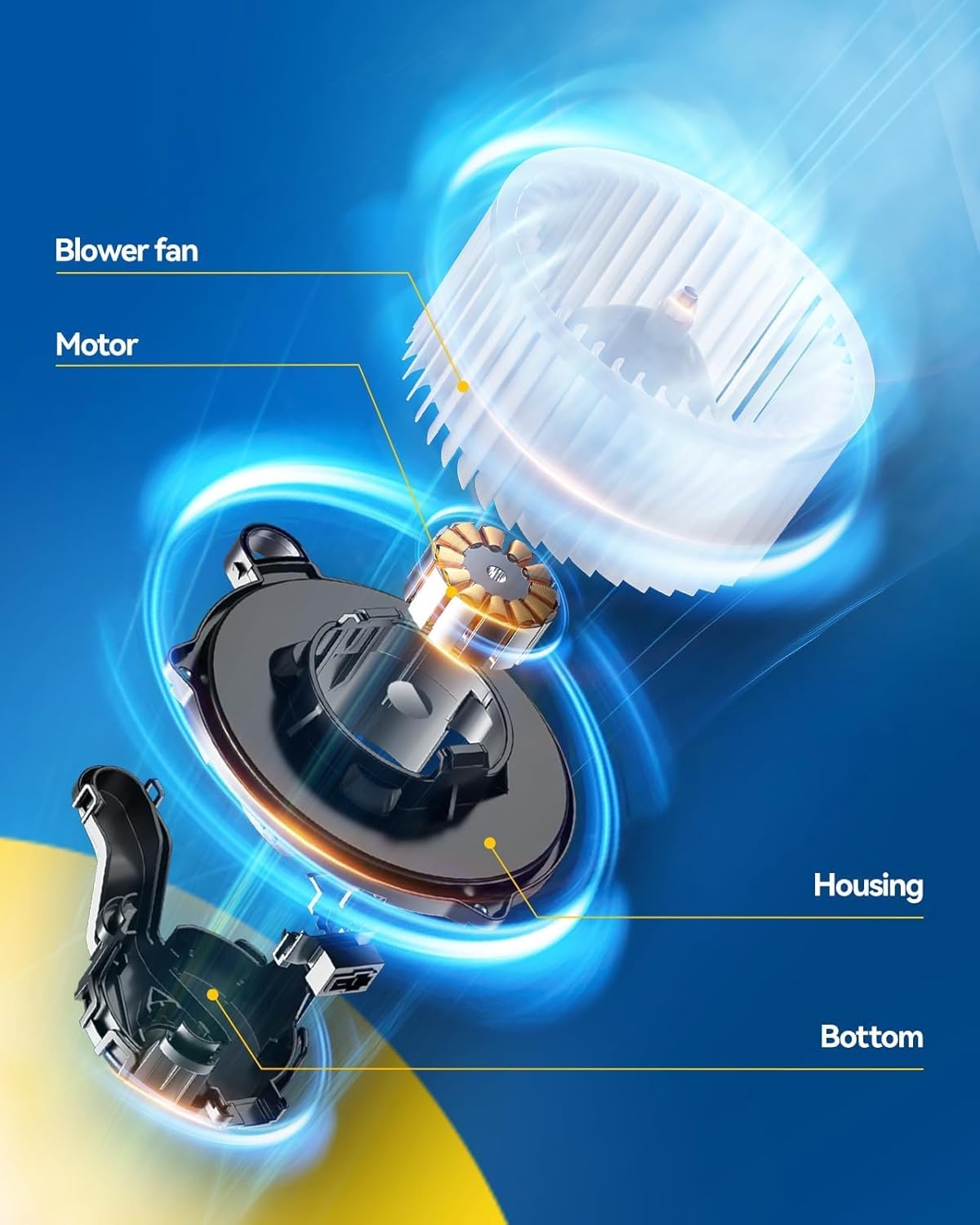 Motor Eficiente em Energia: O design aprimorado do motor do ventilador evita a deposição de poeira, enquanto o fluxo de ar ampliado rapidamente restaura o ar fresco dentro do veículo. Testes mecânicos e elétricos rigorosos asseguram que o motor opere de forma robusta e duradoura. Além disso, o funcionamento mais silencioso e a eficiência energética superior garantem conforto para todos os passageiros.