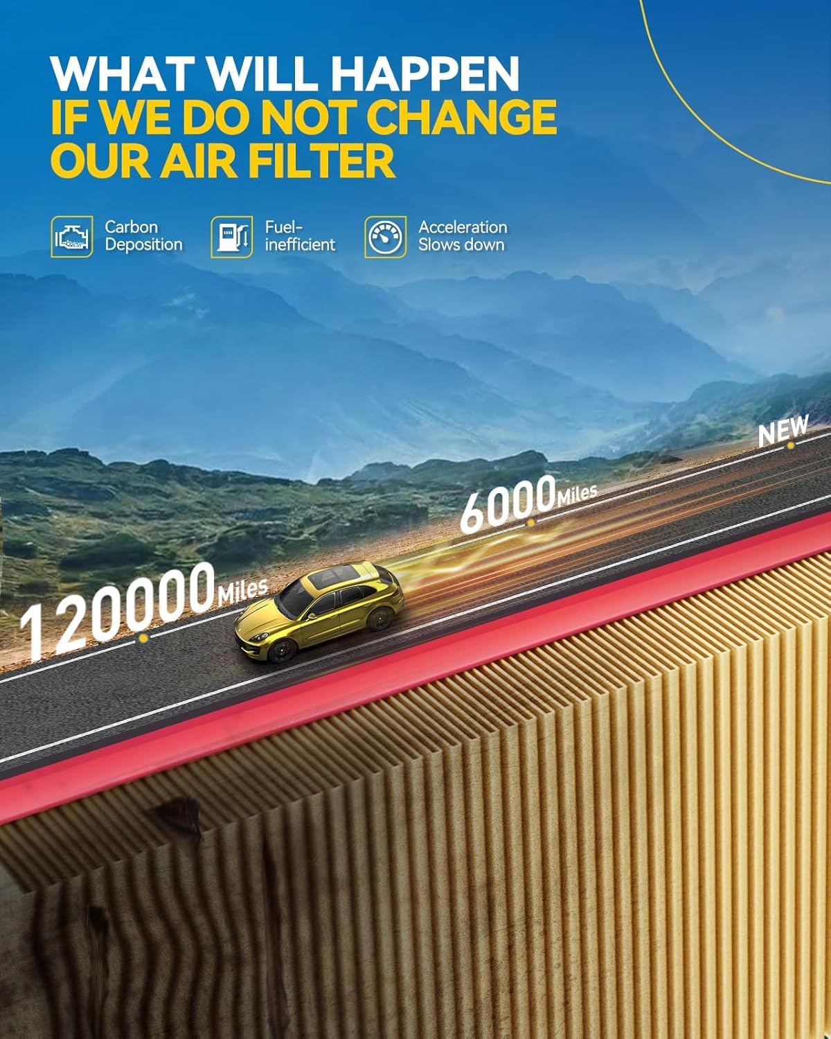 O produto real é sujeito à primeira imagem. Verifique se o filtro de ar é compatível com seu veículo utilizando a caixa de verificação de compatibilidade. Recomendamos a troca do filtro de ar a cada 10.000-12.000 milhas, ou a cada 5.000-6.000 milhas se você dirigir frequentemente em condições de poeira ou umidade.