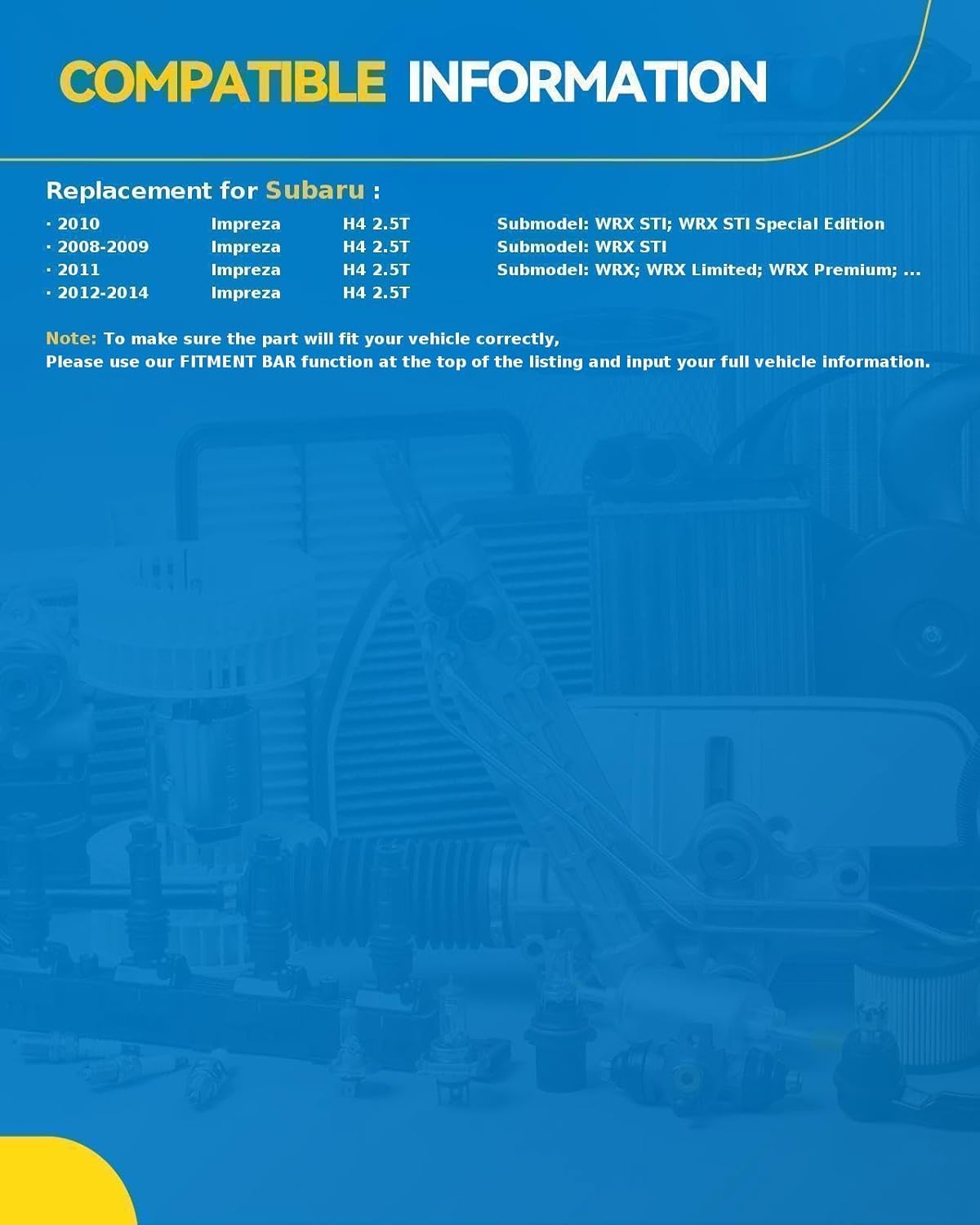 Resposta: Este produto é especificamente projetado para os modelos Subaru Impreza WRX STI de 2008 a 2011 e Impreza 2.5L de 2012 a 2014.
