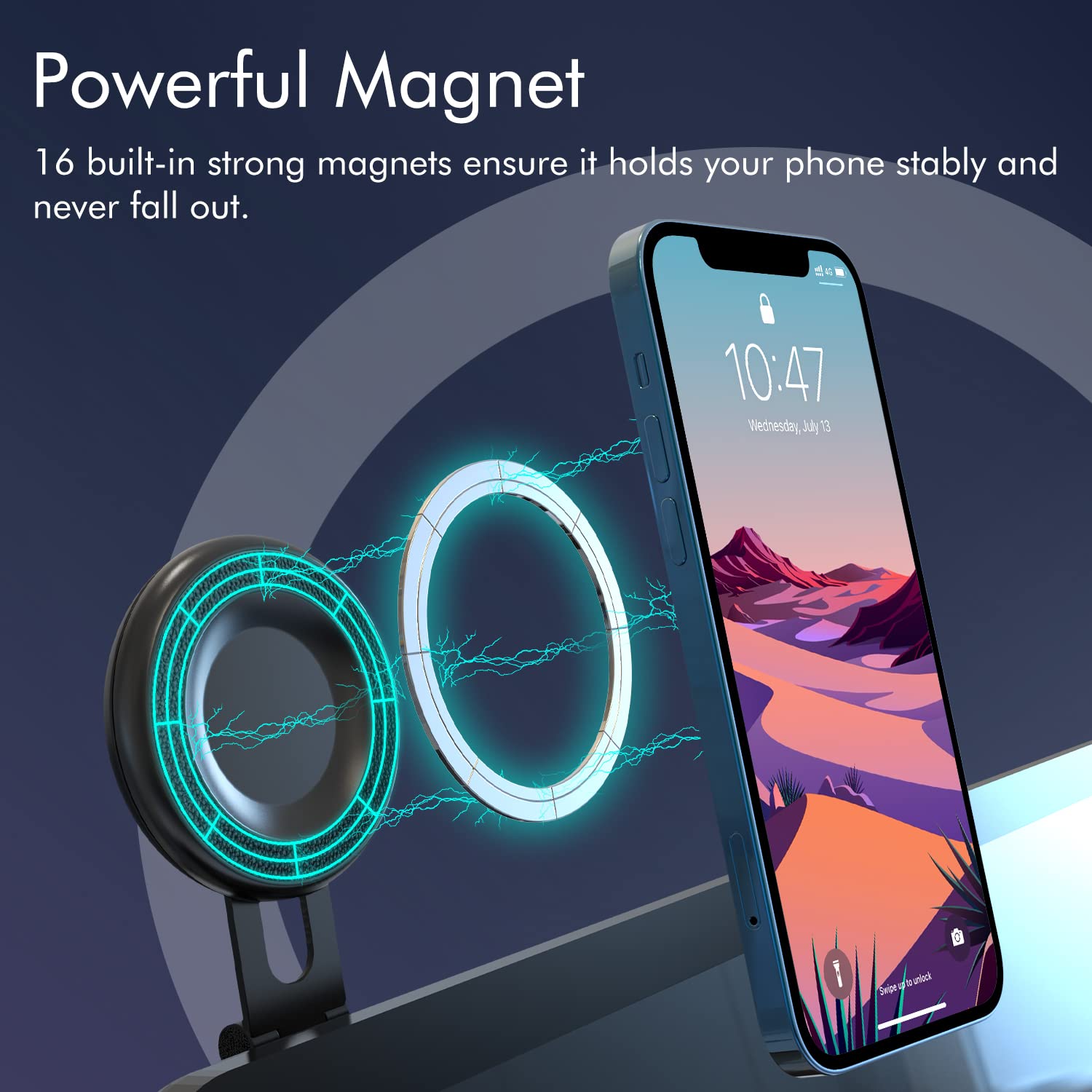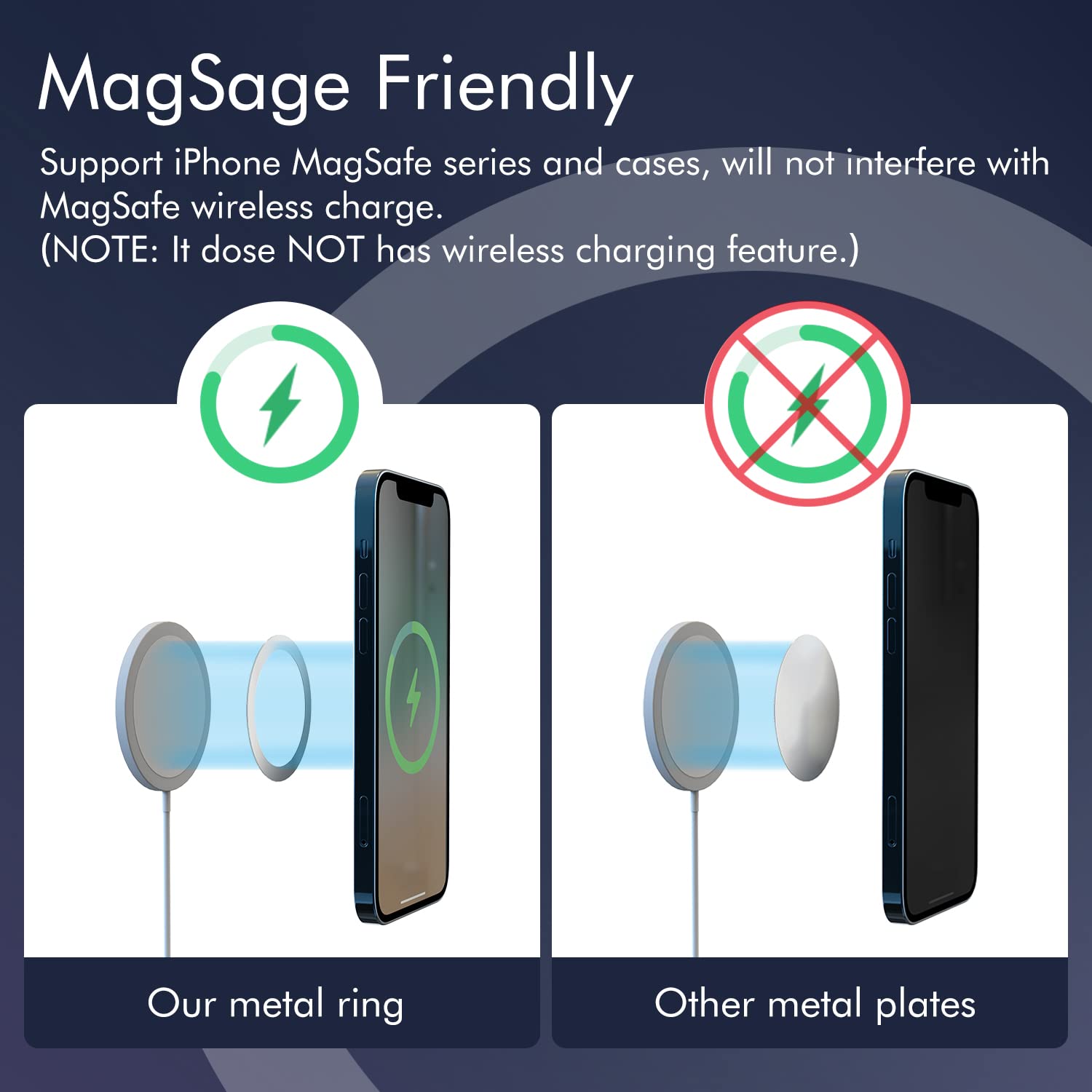 - Compatível com MagSafe: O suporte para carro MagSafe é especialmente projetado para iPhones com MagSafe (séries iPhone 12/13/14). Os ímãs são distribuídos em formato de anel, correspondendo perfeitamente à área MagSafe do iPhone, e o anel metálico não interfere na carga sem fio. (NOTA: Este suporte não possui recurso de carregamento sem fio.)