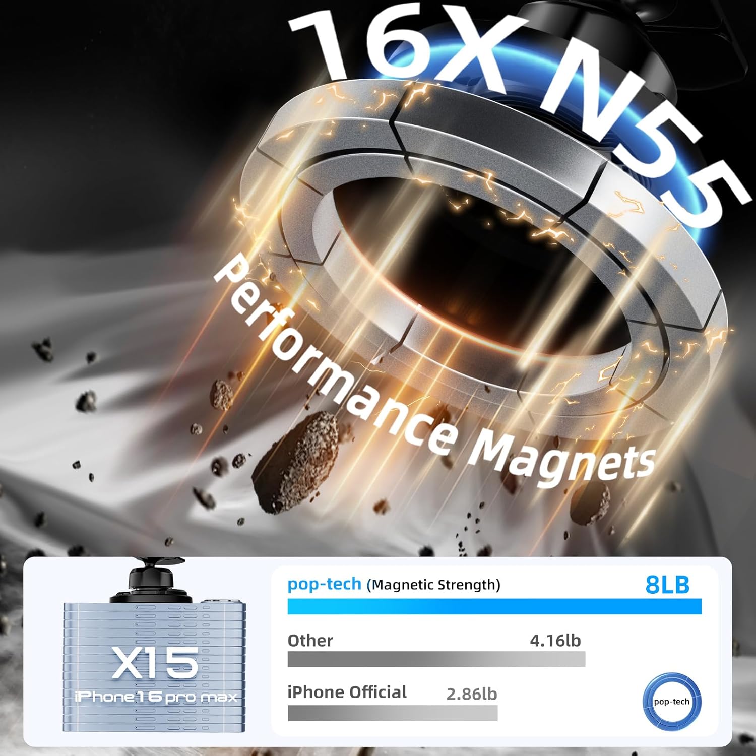 - Força Magnética Ideal: Após milhares de testes, a Pop-Tech encontrou o equilíbrio perfeito da força magnética, utilizando um design 16XN55 que fixa seu celular de forma segura. A colocação e remoção do celular são rápidas e fáceis, sem dificuldades após a adsorção.