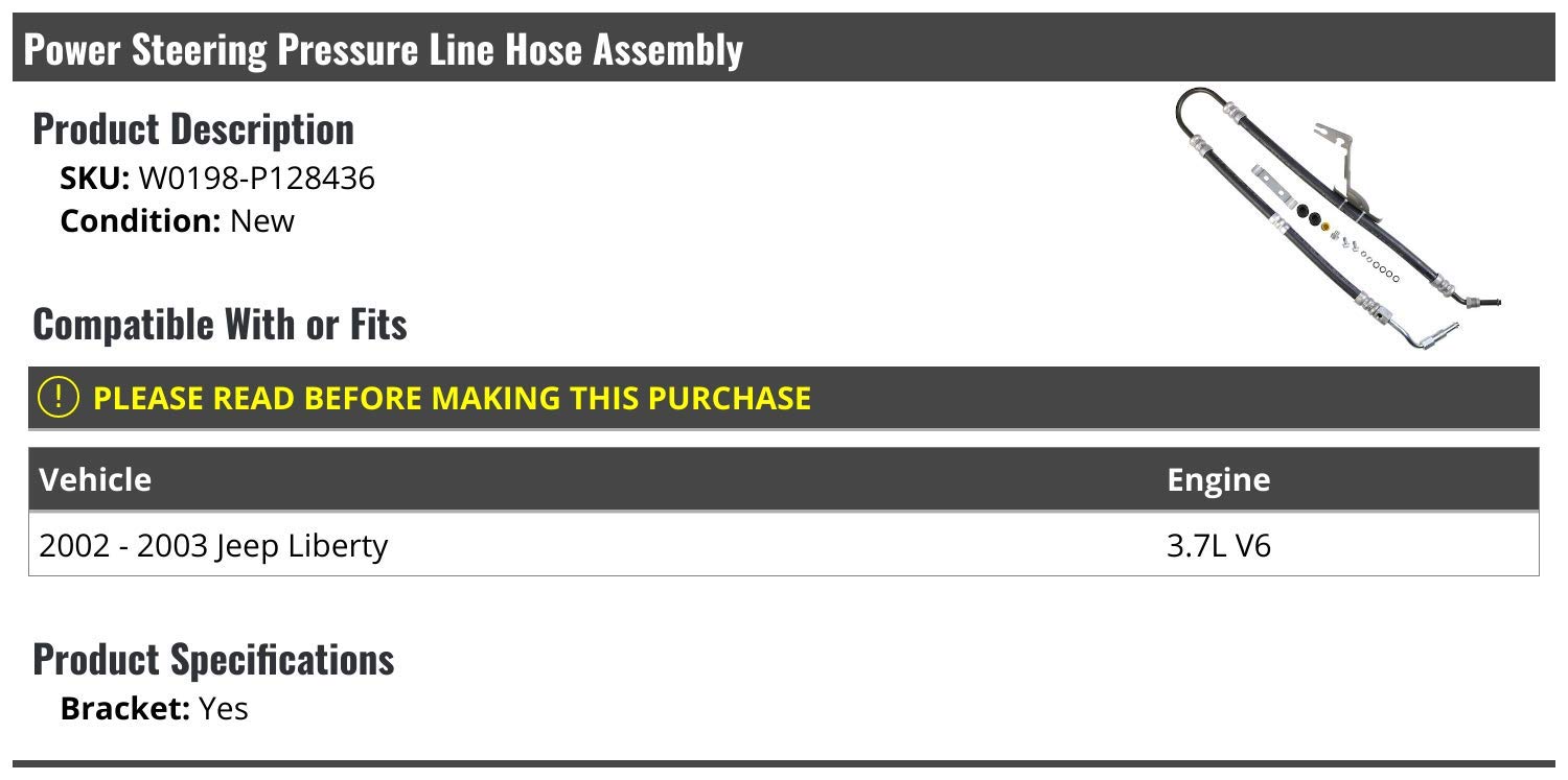 Descrição do Produto: Conjunto de Mangueira de Pressão da Direção Hidráulica – Compatível com Jeep Liberty 2002-2003 3.7L V6