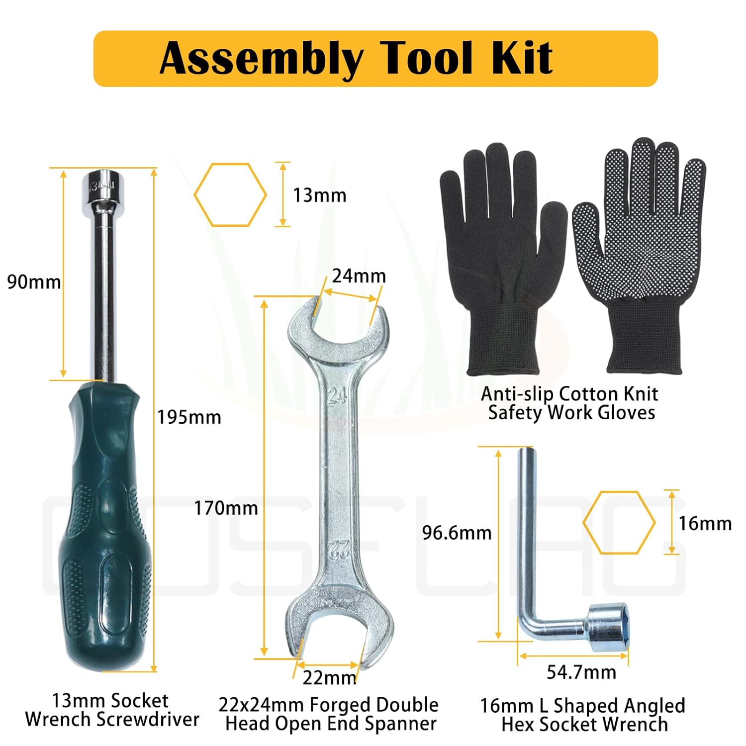 Para facilitar a instalação, o kit inclui uma ferramenta de montagem que torna o processo de substituição do eixo simples e conveniente. O conjunto de ferramentas para montagem do eixo inclui uma chave de boca forjada de 22x24mm, uma chave soquete de 13mm, uma chave hexagonal em L de 16mm e luvas de segurança de algodão anti-derrapante.