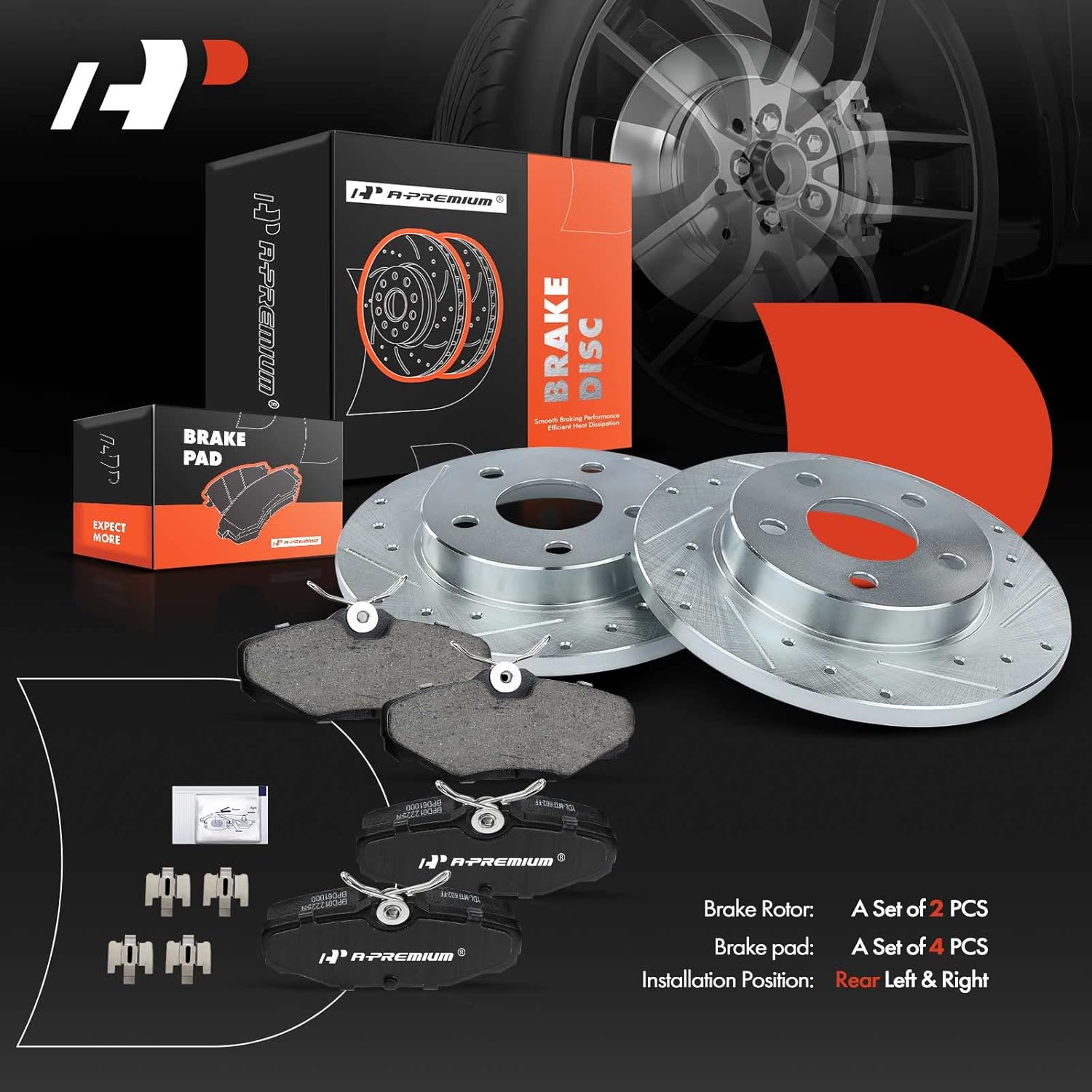 Descrição do Produto: A-Premium 10.08 in (256mm) Rear Drilled and Slotted Disc Brake Rotors Ceramic Pads Kit
