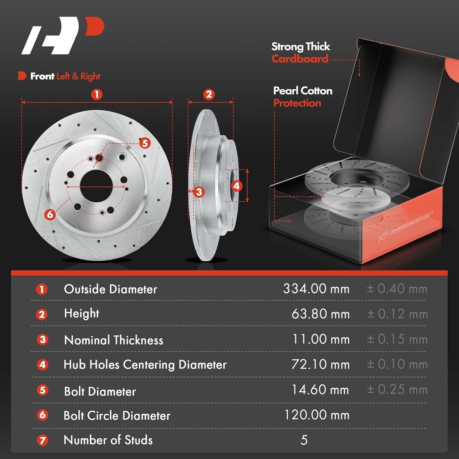 Descrição do Produto: A-Premium 13.15 inch (334mm) Rear Drilled and Passenger Disc Brake Rotors Ceramic Pads Kit