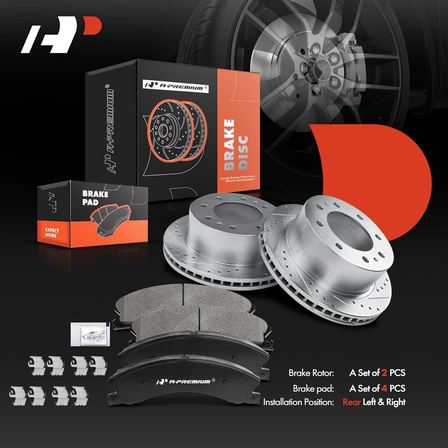 Descrição do Produto: A-Premium 14.18 inch (360 mm) Rear Drilled and Slotted Disc Brake Rotors Ceramic Pads Kit