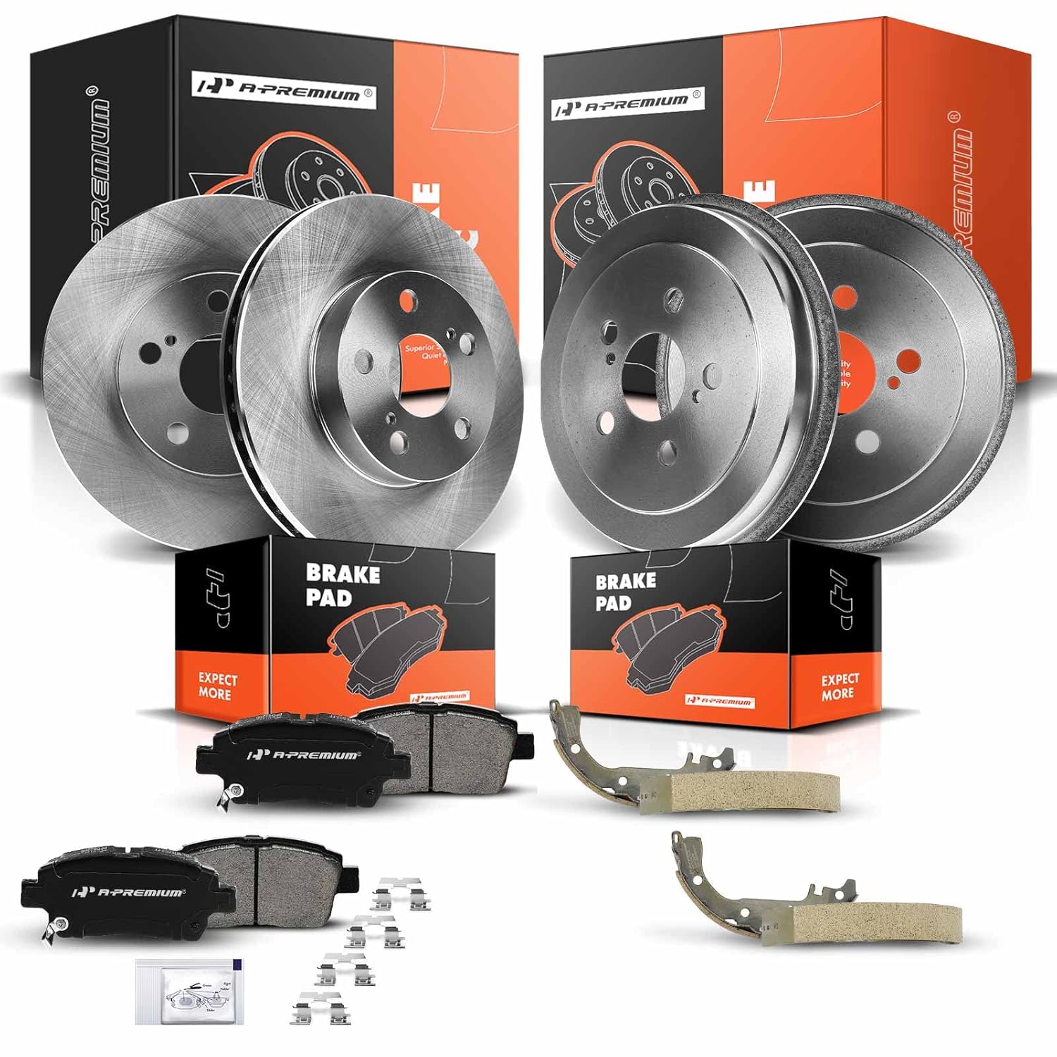 Descrição do Produto: A-Premium Front and Rear Vented Disc Brake Rotors Drums Shoes Ceramic Pads Kit