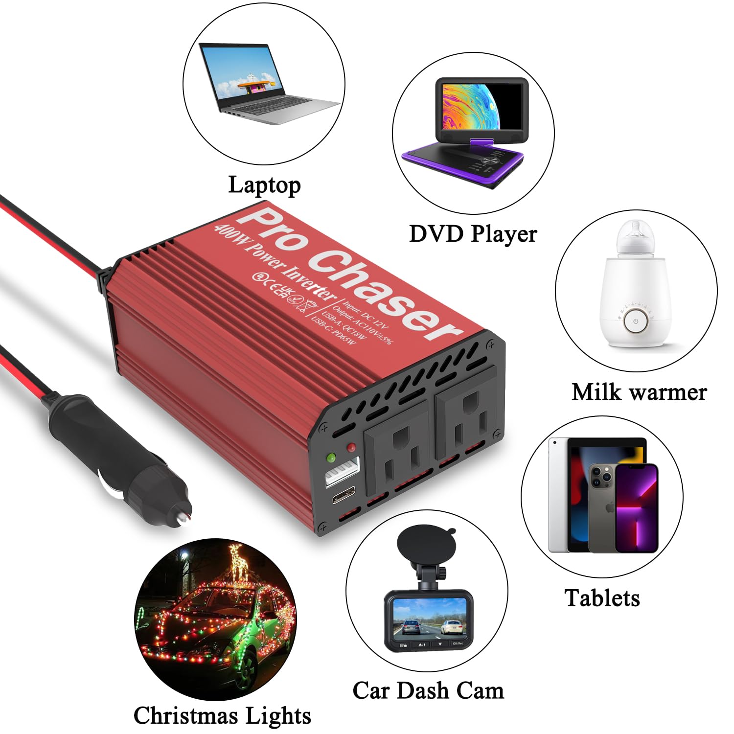 O inversor de potência Pro Chaser 400W é a solução ideal para quem busca converter a energia DC de 12V do veículo em energia AC de 110V, permitindo o uso de diversos aparelhos eletrônicos durante viagens. Com uma capacidade de 400 watts de potência contínua e até 800 watts de pico, este inversor é perfeito para atender às suas necessidades energéticas em movimento. Equipado com duas saídas AC de 110V, uma porta USB-A com carregamento rápido de 18W e uma porta USB-C PD de 65W, o Pro Chaser oferece opções de carregamento versáteis para todos os seus dispositivos.