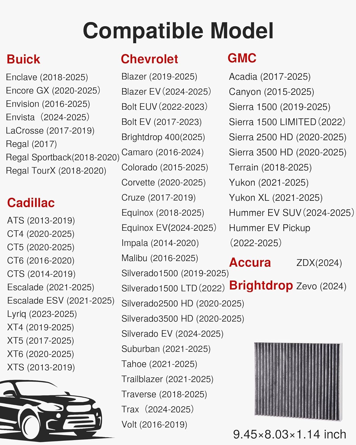 Great product, good price and quality. I have a 2024 Chevy Trax RS1 and this cabin air filter works great on my vehicle.