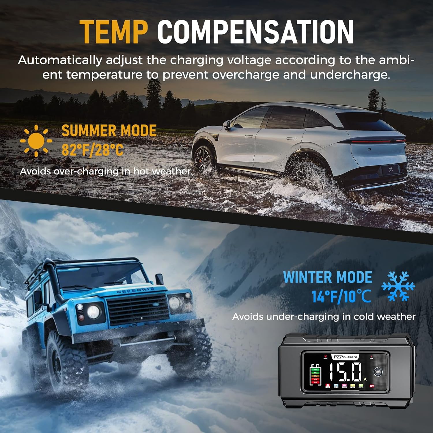 O PZP 15-Amp também conta com uma tela LED colorida de grande visibilidade, que exibe dados essenciais de carregamento, como tensão, corrente, temperatura interna (℉/°C), porcentagem de carga, modo de verão e modo de inverno. Isso permite que você monitore o status da sua bateria em tempo real, mesmo sob luz solar direta. O cabo de carregamento de 6,7 pés proporciona conveniência adicional para baterias de difícil acesso.