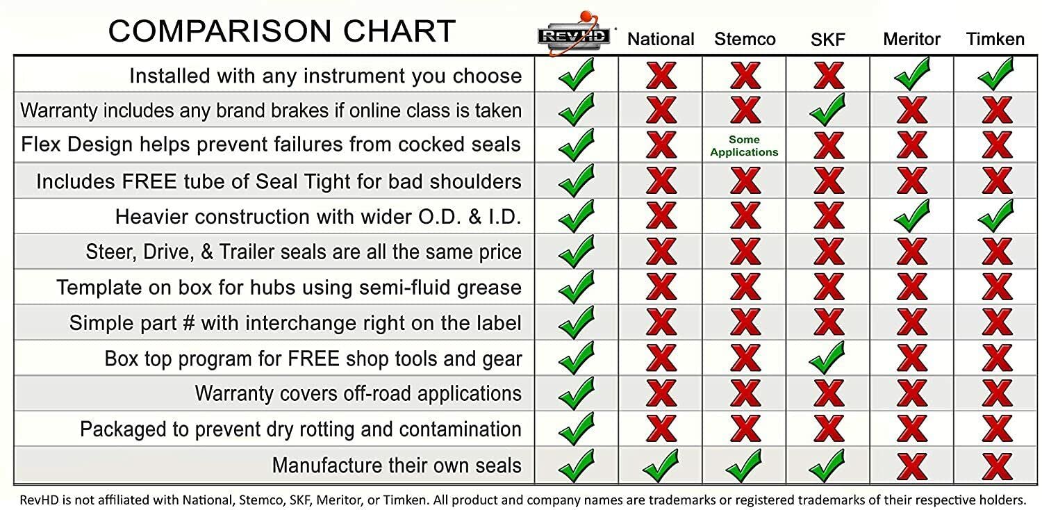O selo é projetado para suportar uma ampla faixa de temperatura, variando de -40°F a 225°F (-40°C a 107°C), tornando-o ideal para diversas condições operacionais. A versão Rev 1 é o nosso selo padrão, que contém lábios de vedação internos em NBR e vem com uma garantia de 1 ano. Ele é compatível com as referências CR/SKF 47691, 47692, 47695, 47697, FM 370003A, 380003A, Stemco 393-0173, 392-9131, 393-0273 e 309-0973, sendo equivalente à série National 37000 e ao Stemco Voyager Meritor Standard 01 Series.