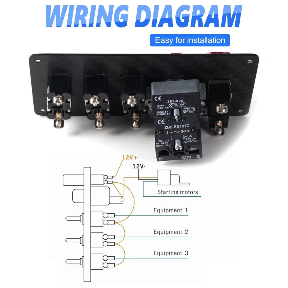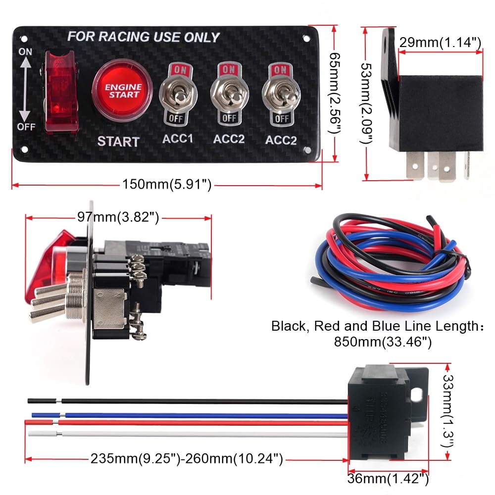 Este painel de ignição multifuncional 5 em 1 é composto por um interruptor deslizante vermelho ON/OFF com tampa de segurança, um botão de partida do motor vermelho e três interruptores adicionais para usos variados. Acompanha um relé que controla os botões, proporcionando uma experiência de uso prática e eficiente. A instalação de um interruptor de desligamento permite cortar instantaneamente a alimentação elétrica do veículo, oferecendo a sensação de estar ao volante de um carro de corrida e trazendo um prazer de condução inigualável.