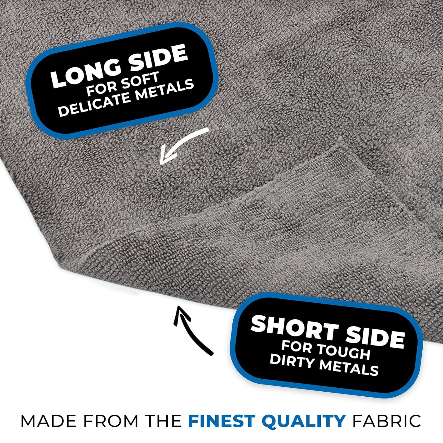 ☑️ CONSTRUÇÃO PROFISSIONAL DE DUPLA PILHA – Um lado possui fibras ligeiramente mais longas, ideais para polir o delicado alumínio e metais macios das rodas de alto padrão. O outro lado apresenta uma trama de felpa mais curta e apertada, que remove rapidamente o excesso de polimento de acabamentos em aço inoxidável, cromo e outras superfícies metálicas mais duras.