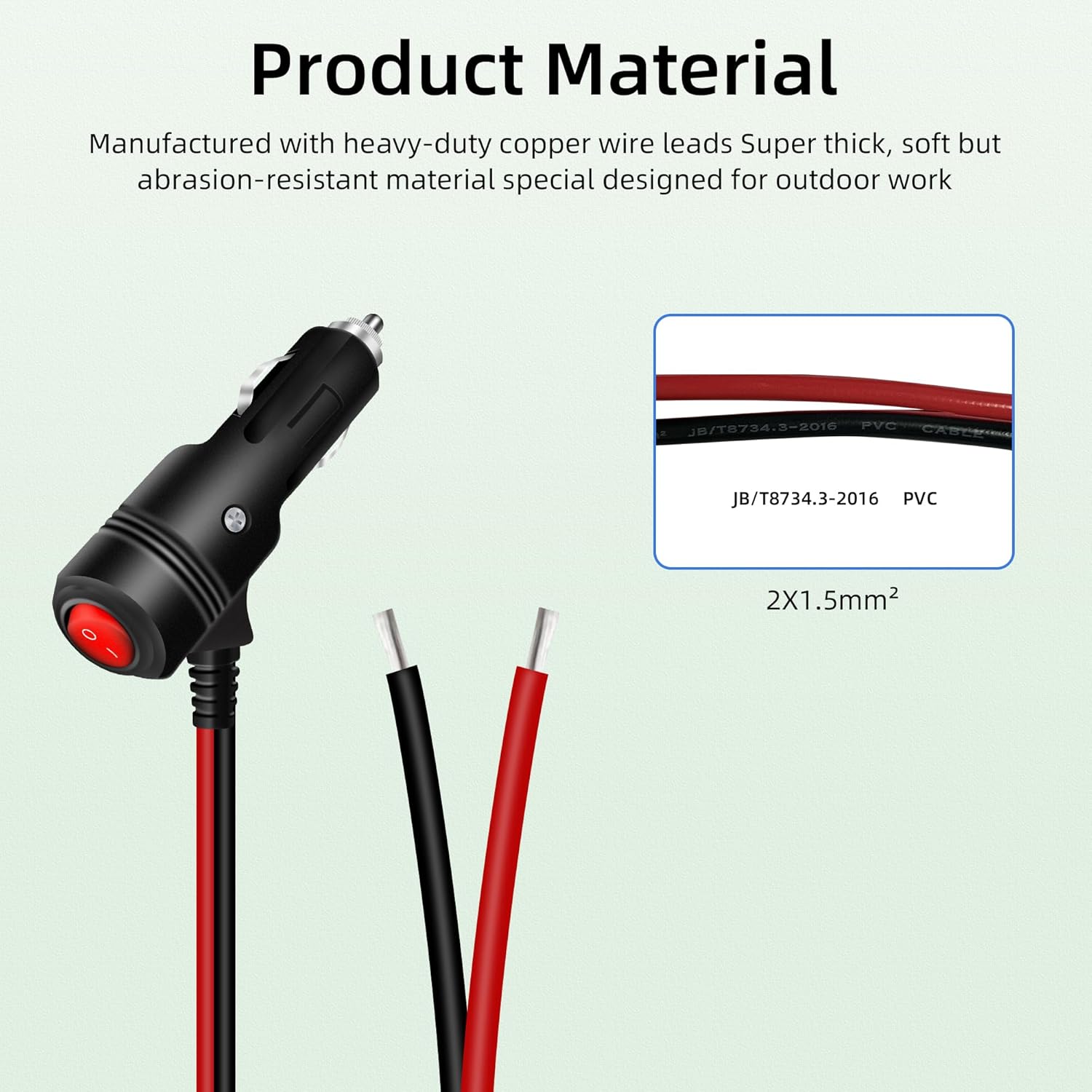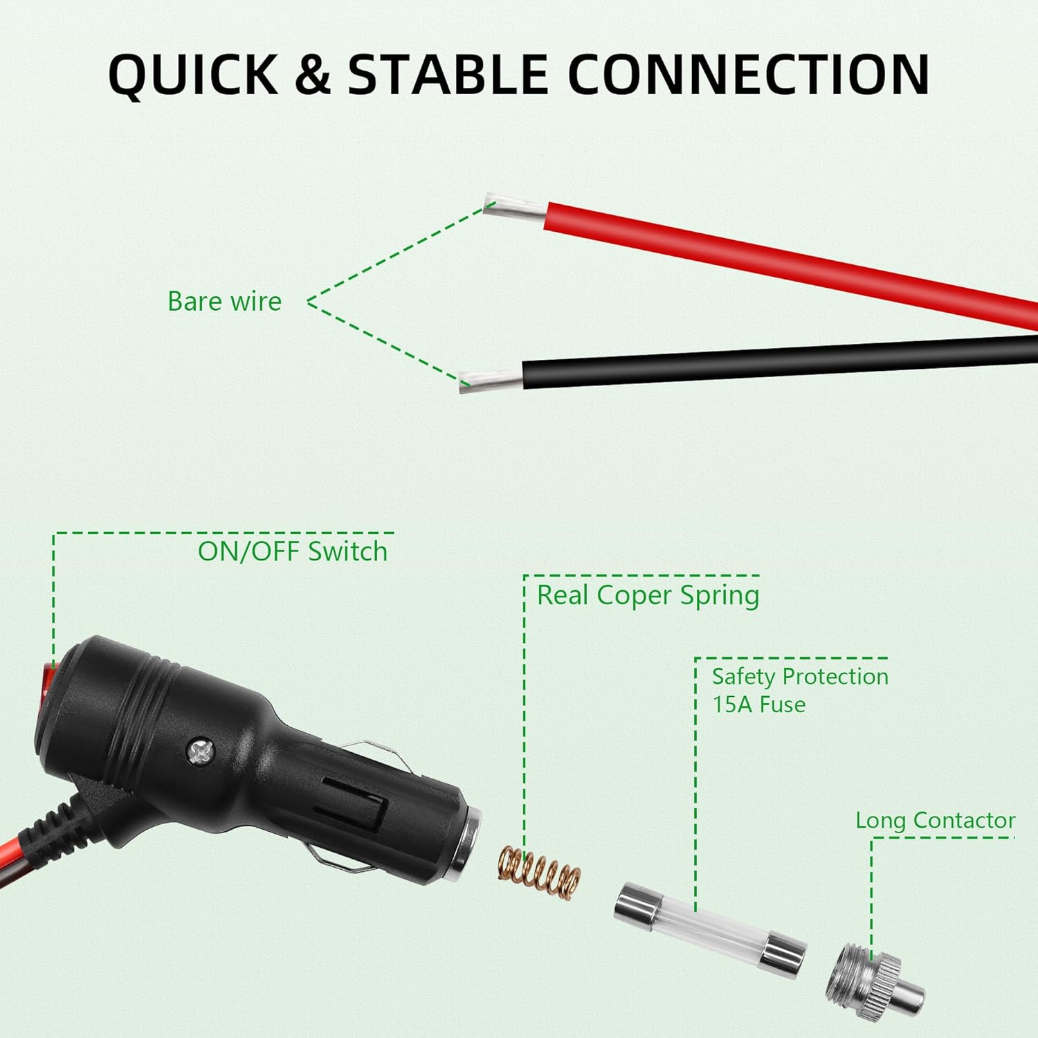 - Instalação Fácil: O soquete do isqueiro vem com uma tampa de fusível embutida para melhor proteção dos equipamentos elétricos, facilitando a conexão em ambas as extremidades. (O fio vermelho conecta-se à fonte de energia positiva, enquanto o fio preto conecta-se à fonte de energia negativa.)