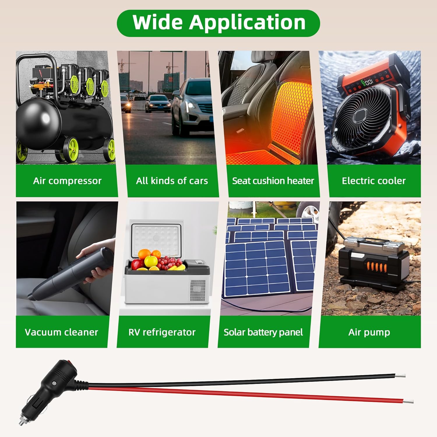 - Proteção de Segurança: O plugue do isqueiro é equipado com um fusível de 15A que protege seu veículo e equipamentos. A luz LED indica a presença de energia, e o adaptador é compatível com dispositivos de alimentação de 12V/24V, como carros marinhos, compressores de ar, inversores, caminhões, motocicletas, RVs, barcos e ATVs.
