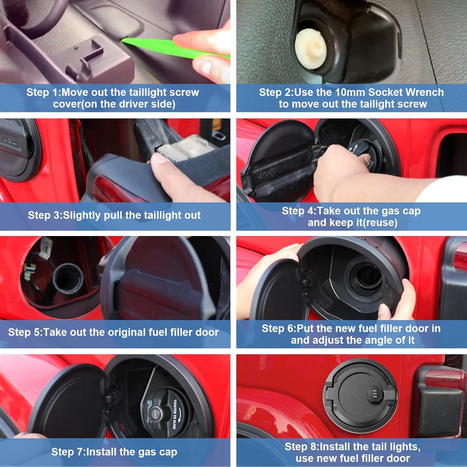 Para utilizar o ROCCS Gas Tank Cap Cover, comece garantindo que o tanque de combustível do seu Jeep Wrangler esteja vazio e limpo. Posicione o capô sobre a abertura do tanque e alinhe os orifícios de fixação. Utilize as ferramentas necessárias para apertar os parafusos, garantindo que o capô esteja firmemente preso. Para desbloquear, insira a combinação correta e gire o mecanismo para abrir. Após o uso, certifique-se de travar novamente o capô para manter a segurança do seu combustível.