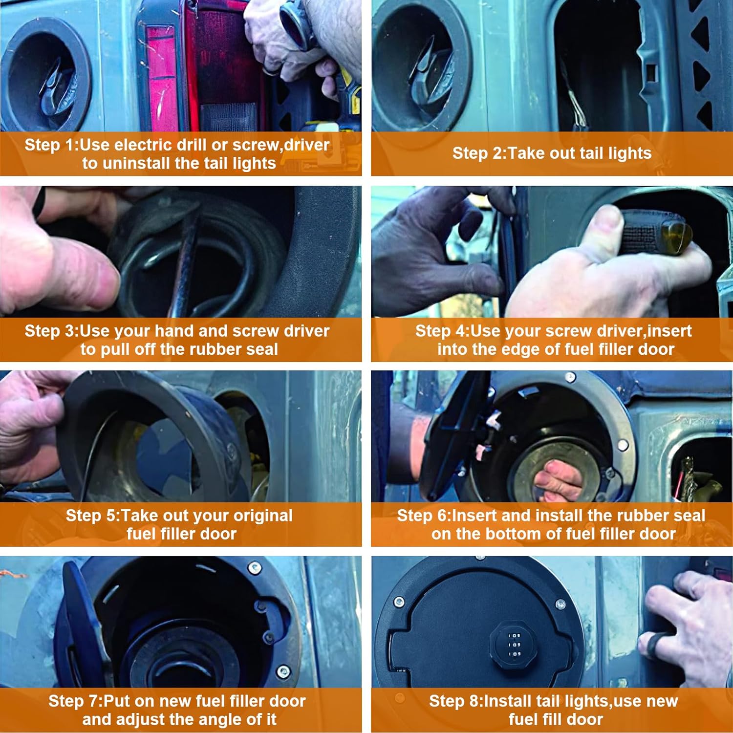 Para utilizar o ROCCS Gas Tank Cap Cover, comece garantindo que o tanque de combustível do seu Jeep Wrangler esteja vazio e limpo. Posicione o capô sobre a abertura do tanque e alinhe os orifícios de fixação. Utilize as ferramentas necessárias para apertar os parafusos, garantindo que o capô esteja firmemente preso. Para desbloquear, insira a combinação correta e gire o mecanismo para abrir. Após o uso, certifique-se de travar novamente o capô para manter a segurança do seu combustível.