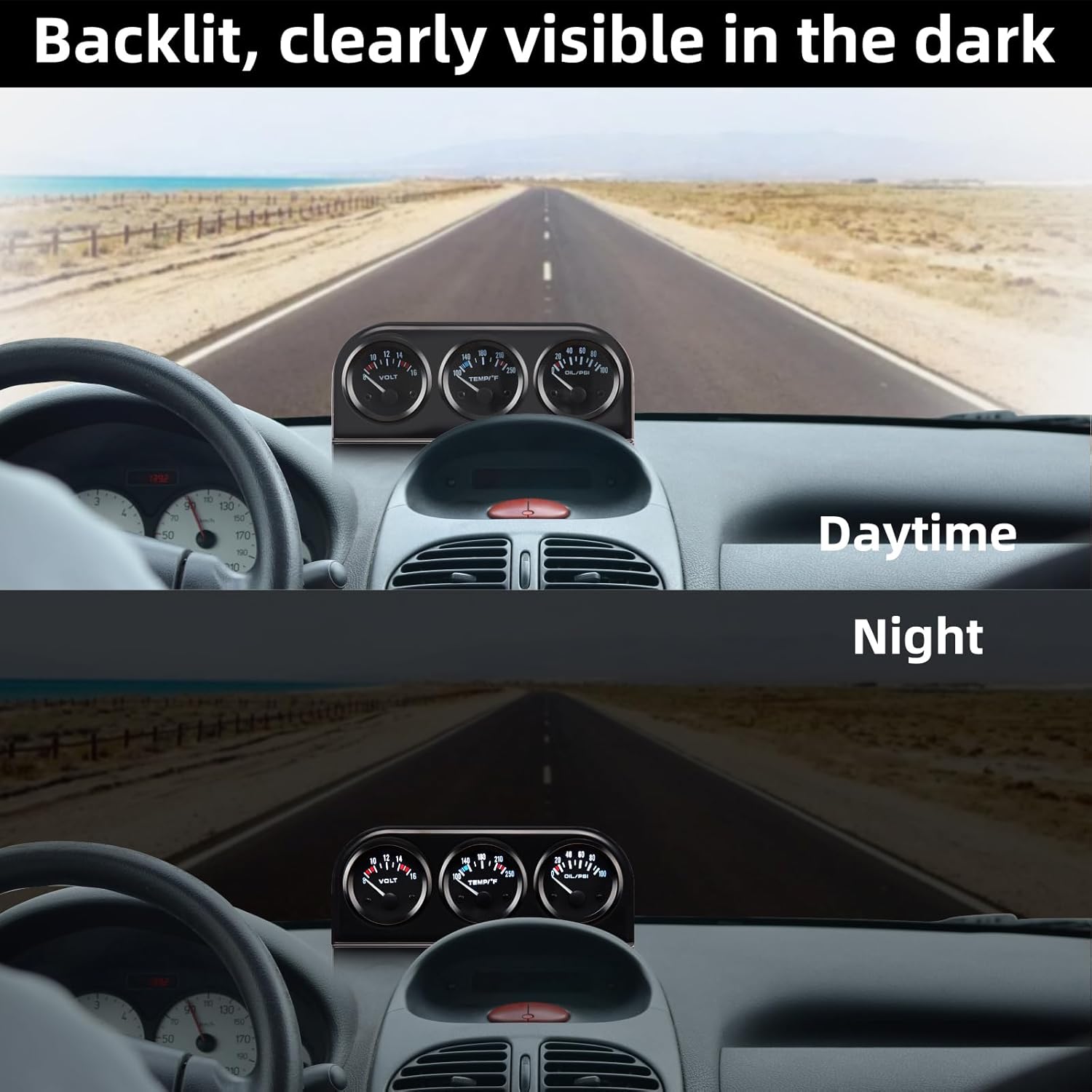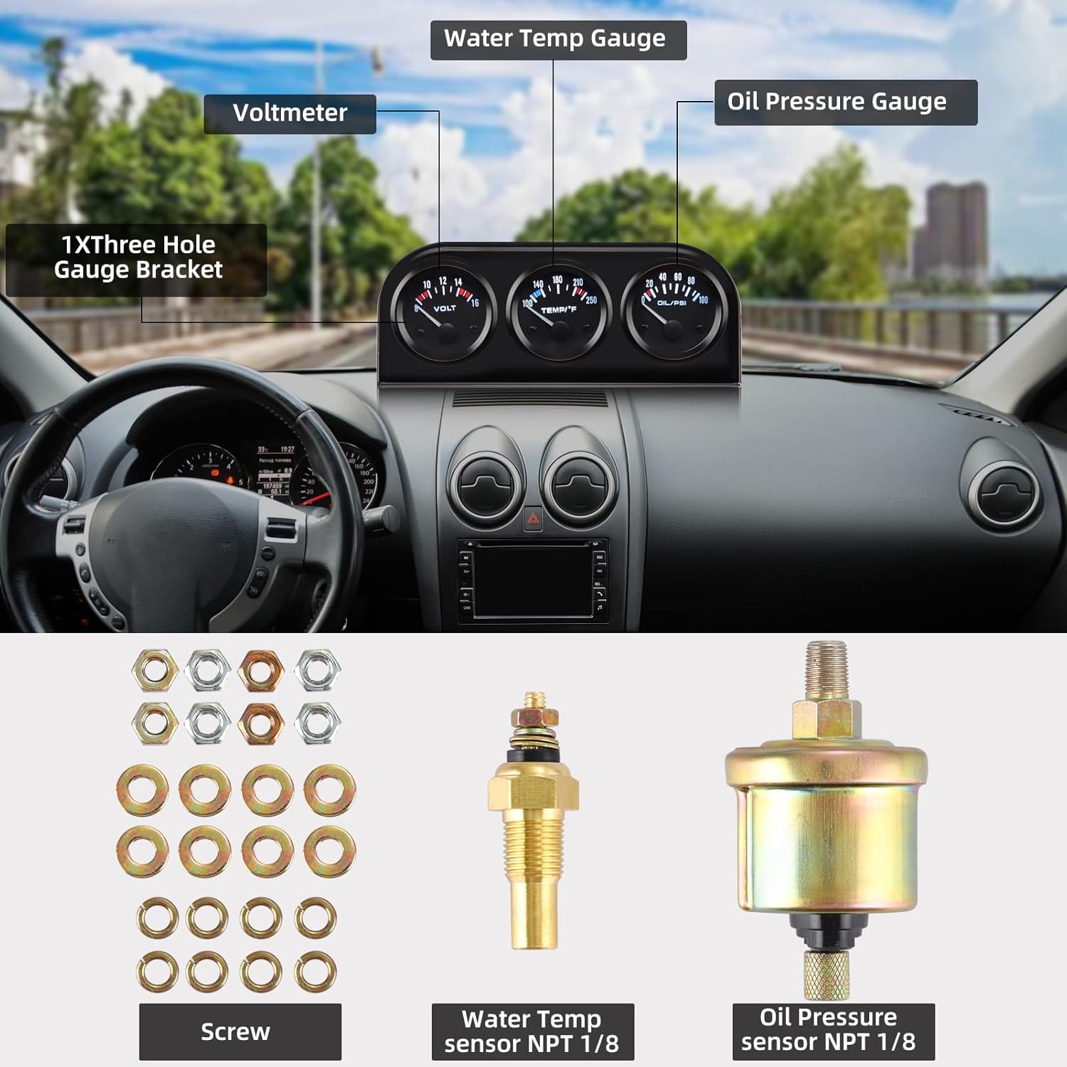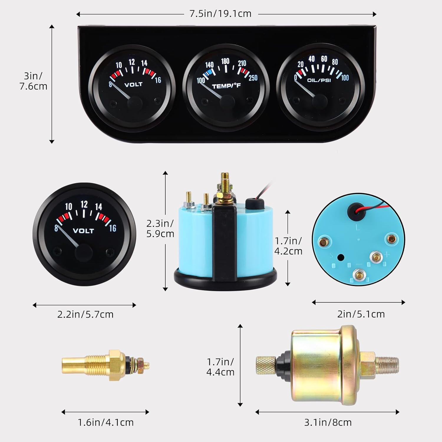 Kit de Manômetros Rupse 2″ 52mm – Voltímetro, Termômetro de Água e Manômetro de Pressão de Óleo para Carros 12V
