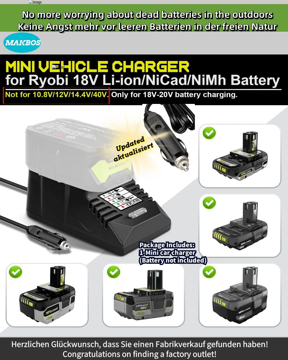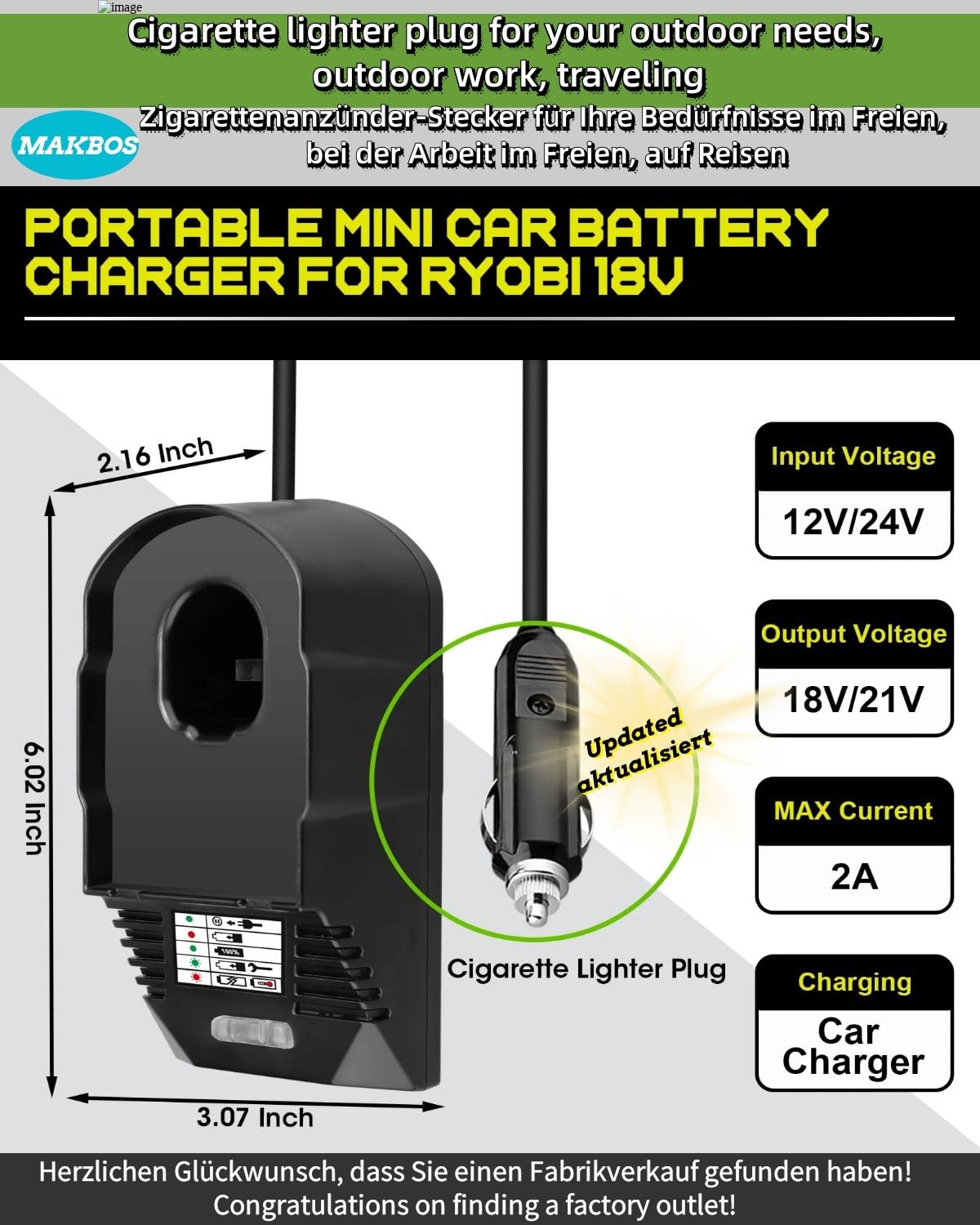 - Plugue de Isqueiro 12V – Projetado para uso em veículos, este carregador permite que você carregue suas baterias Ryobi 18V em qualquer lugar, mesmo na ausência de energia elétrica. É a solução ideal para viagens e acampamentos.