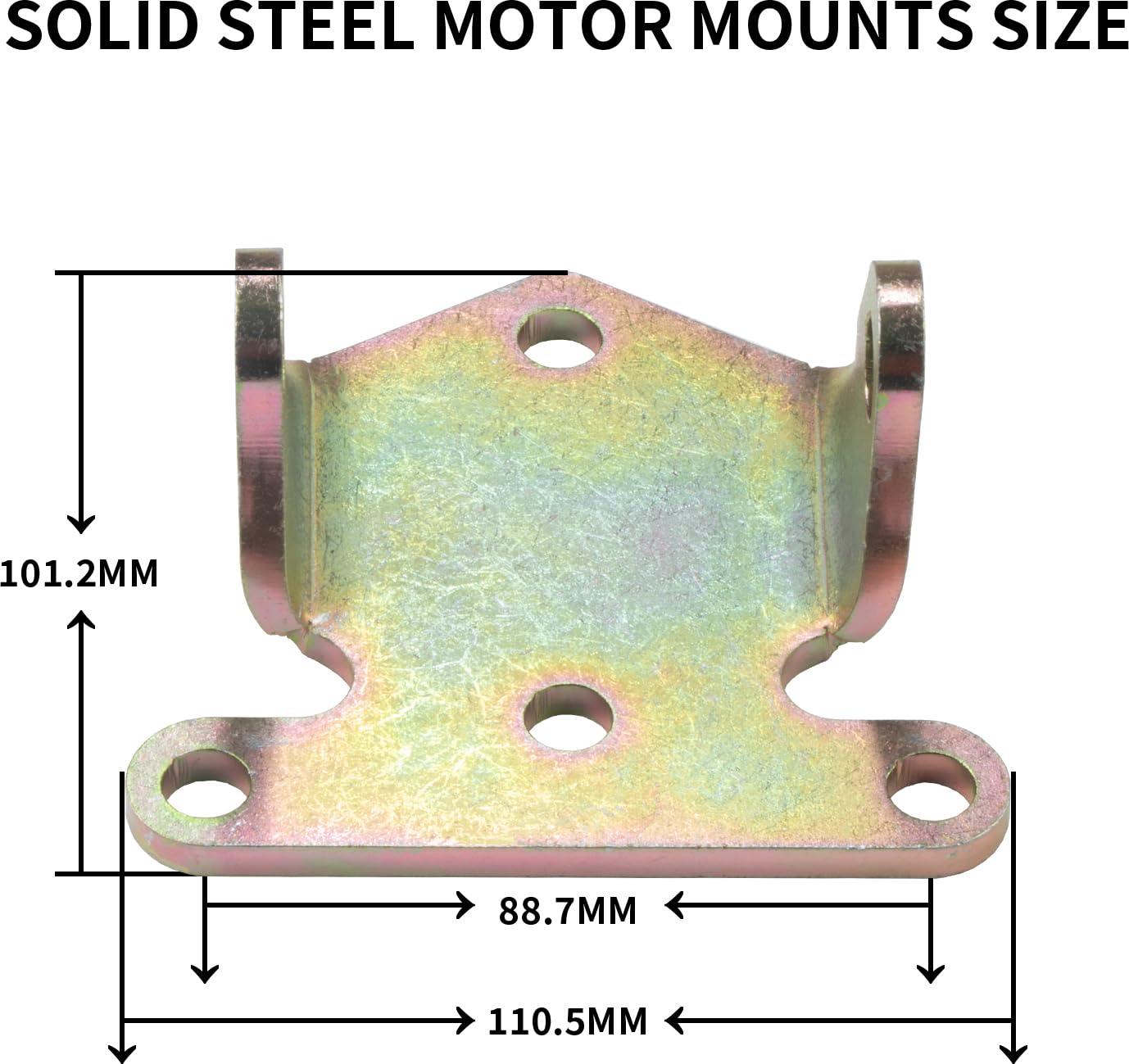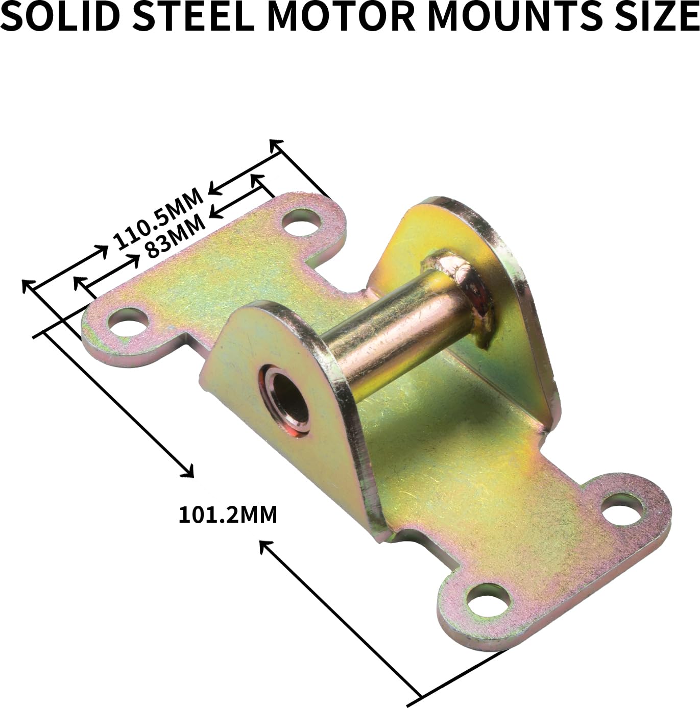 As dimensões dos centros de montagem são 2-5/16″ x 5-1/16″, com uma altura no centro de 2″ e uma distância da superfície do quadro até o centro do furo de montagem de 1″. A largura na manga de montagem é de 2-3/8″. Este conjunto inclui 2 novos suportes de motor de aço sólido e 2 novos pads de chassi de aço sólido, substituindo os suportes de borracha de estilo original e eliminando o movimento excessivo do motor em aplicações de alto desempenho, o que pode resultar em perda de torque e travamento da ligação. Eles também são ideais para construções de chassi personalizadas.