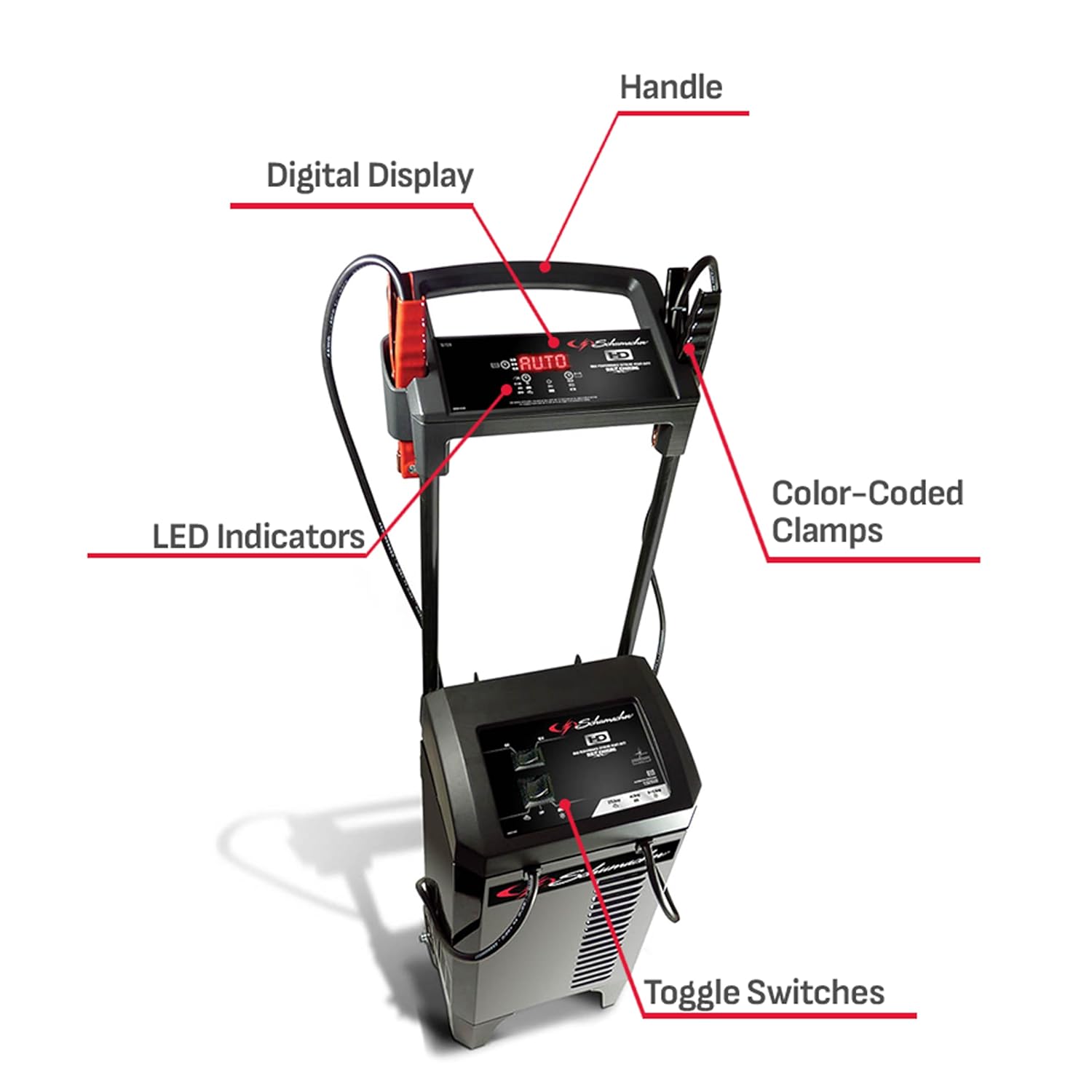 Descrição do Produto: Carregador de Bateria e Partida de Motor Schumacher Elétrico com Rodas, SC1326