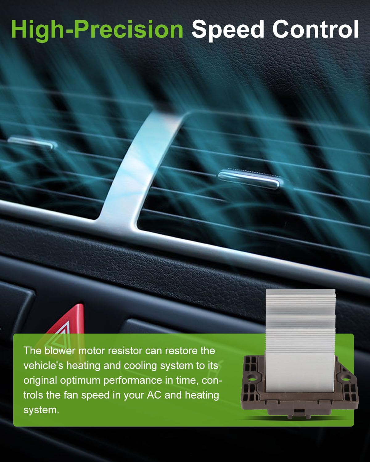 • FUNCTION: Este resistor é responsável por restaurar o sistema de aquecimento e resfriamento do veículo ao seu desempenho ideal, controlando a velocidade do ventilador no sistema de ar condicionado e aquecimento. Seu design durável previne falhas no fusível térmico, superaquecimento e queima.