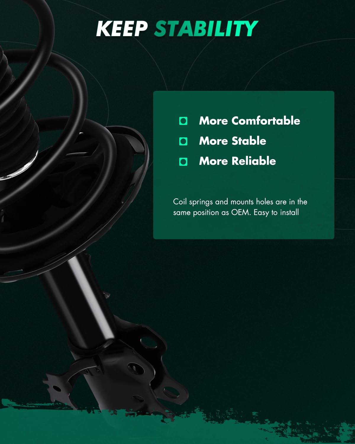 - SUBSTITUIÇÃO COMPLETA: O conjunto completo de absorvedores inclui amortecedor, mola helicoidal, rolamento, suporte do amortecedor, batente do amortecedor, bota do amortecedor e isolador, oferecendo tudo o que você precisa para uma instalação eficiente.