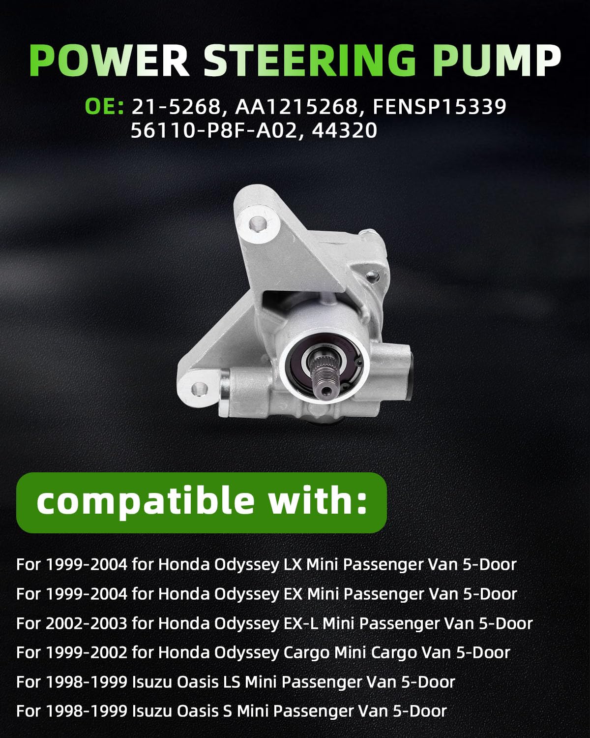 - VEÍCULOS COMPATÍVEIS: Bomba de assistência para Honda Odyssey de 1999 a 2004 e Isuzu Oasis de 1998 a 1999.