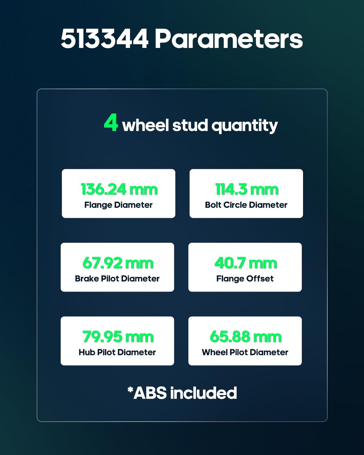 - ESPECIFICAÇÕES E PARÂMETROS – Quantidade de Parafusos: 4 Parafusos, eixo dianteiro, ABS: Sim, OE 513344. O desempenho OE garante que não haja ruídos anormais ou conexões defeituosas.