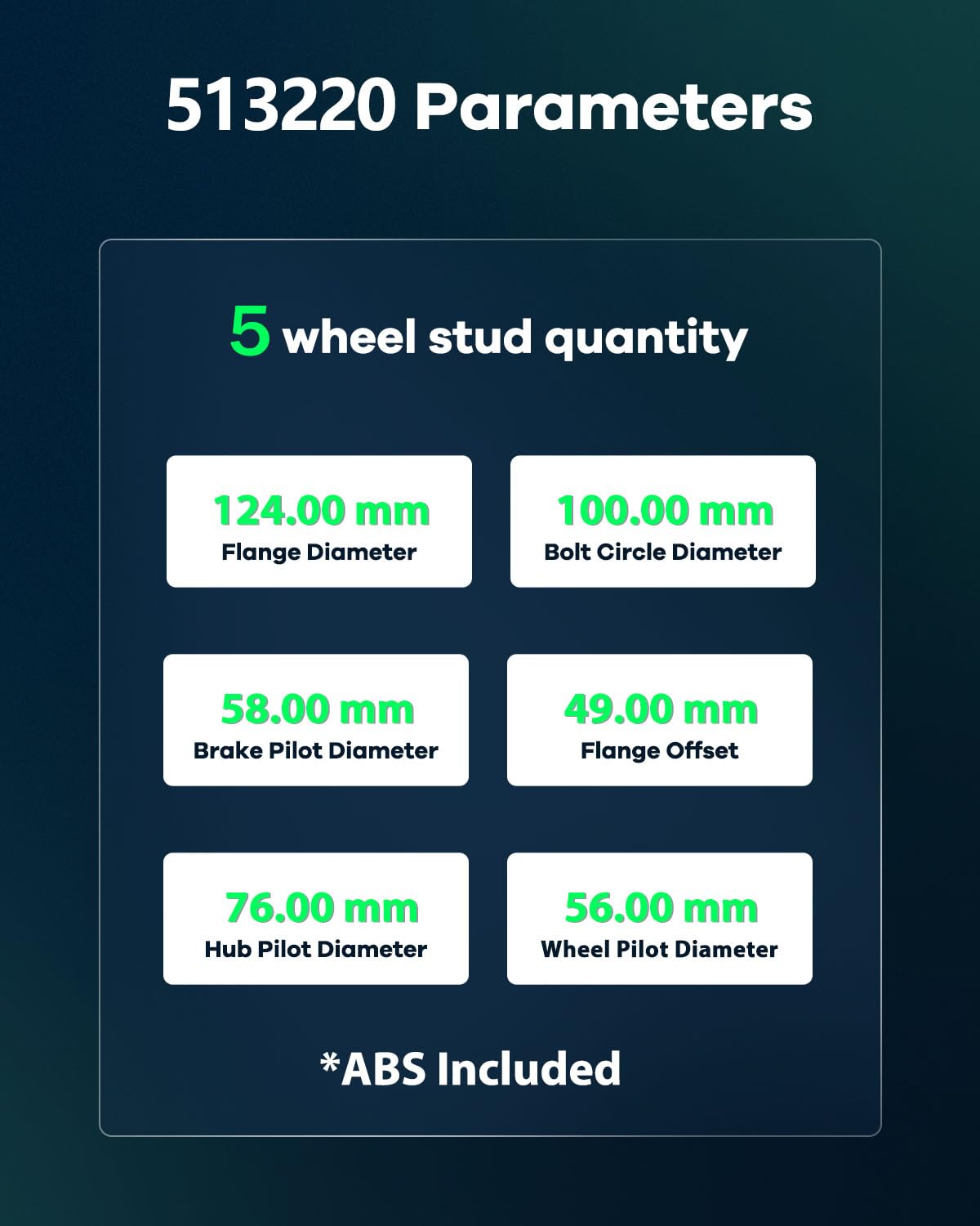 - ESPECIFICAÇÕES E PARÂMETROS – Quantidade de Parafusos: 5 Parafusos, eixo dianteiro, ABS: Sim, OE 513220. O desempenho OE assegura que não haja ruídos anormais ou conexões defeituosas.