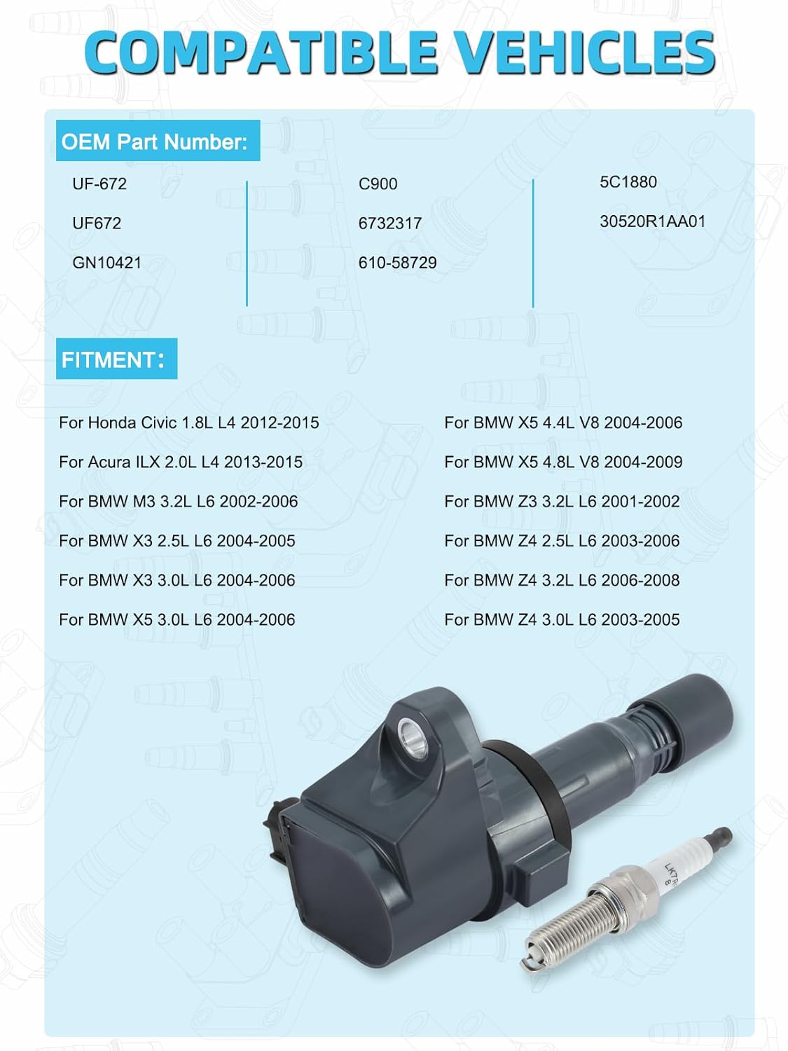 Resposta: As bobinas UF672 são projetadas especificamente para Honda Civic 1.8L L4 (2012-2015) e Acura ILX 2.0L L4 (2013-2015). Para outros modelos, consulte o número da peça OEM.