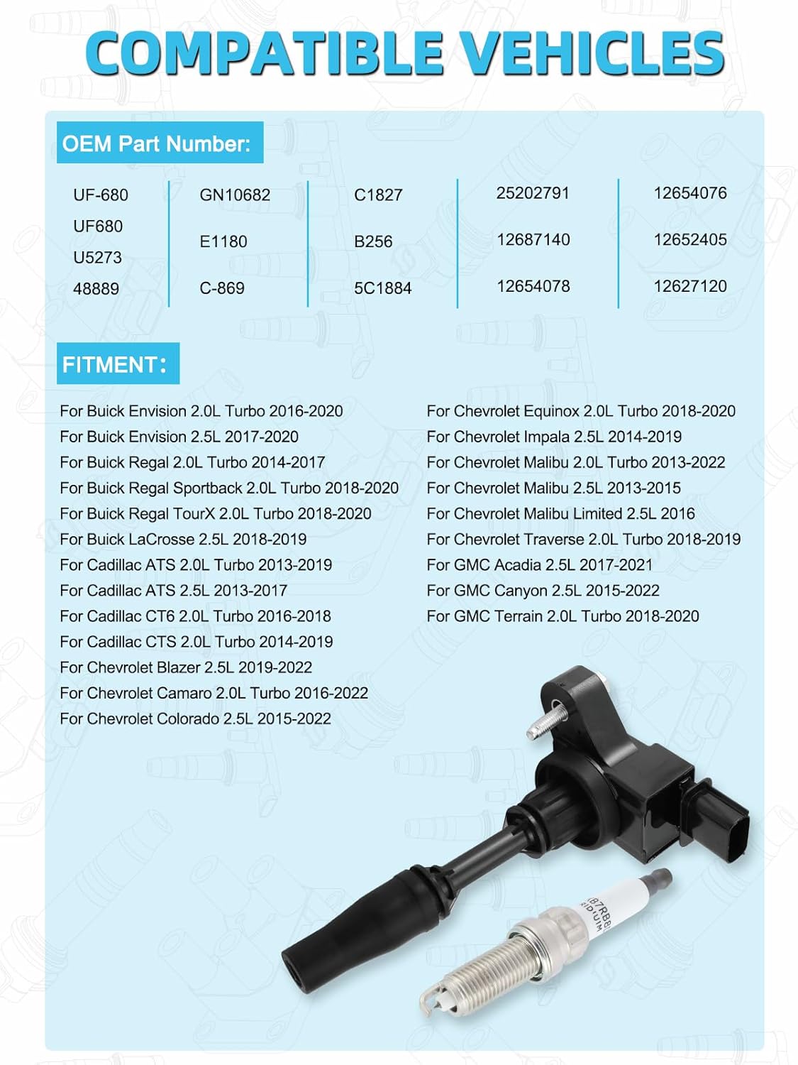 O Conjunto de 4 Bobinas de Ignição UF680 é a solução ideal para quem busca desempenho e confiabilidade em veículos como Buick Envision, Regal, Cadillac ATS, CTS, Chevrolet Camaro, Colorado, Impala, Malibu, e GMC Acadia, Canyon e Terrain. Com um design meticulosamente elaborado, este conjunto de bobinas é compatível com uma ampla gama de modelos, garantindo que você tenha a peça certa para o seu carro.