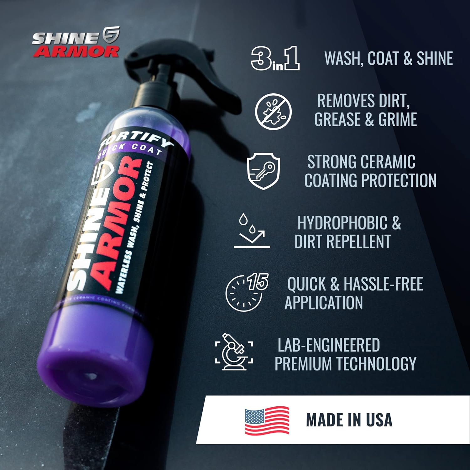 Com sua fórmula 3 em 1, o SHINE ARMOR Fortify Quick Coat é um revestimento cerâmico hidrofóbico que proporciona uma lavagem sem água, uma camada protetora e um brilho intenso, tudo em um único produto conveniente. Este spray de cera para carro é seguro para todas as superfícies, podendo ser utilizado em automóveis, barcos, motocicletas, trailers e muito mais. A combinação perfeita de surfactantes e ciência de revestimento cerâmico SiO2 garante uma proteção duradoura e um acabamento impecável.