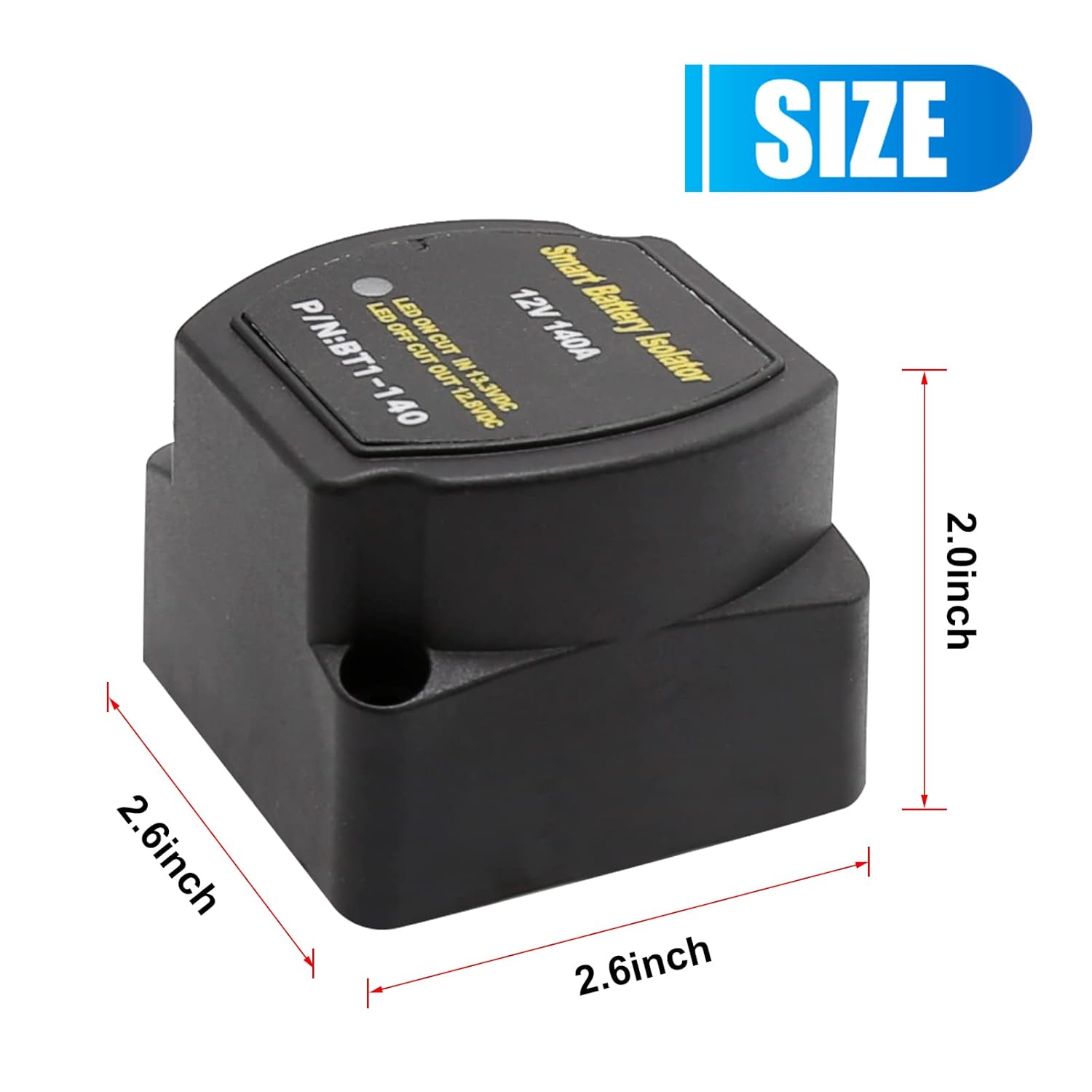 O Isolador de Bateria Dupla Inteligente de 12V 140A é um relé sensível à voltagem (VSR) ideal para veículos como ATVs, UTVs, RVs, campers, vans, caminhões, motorhomes, barcos e veículos off-road. Suas principais características incluem:
