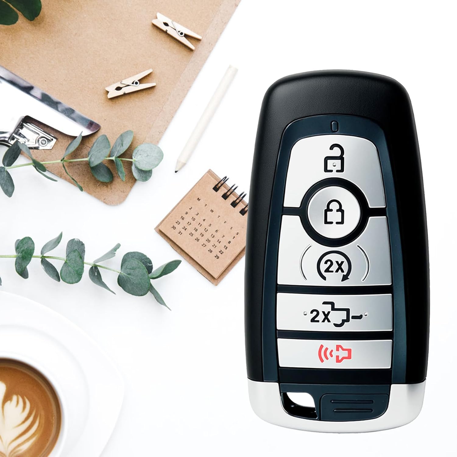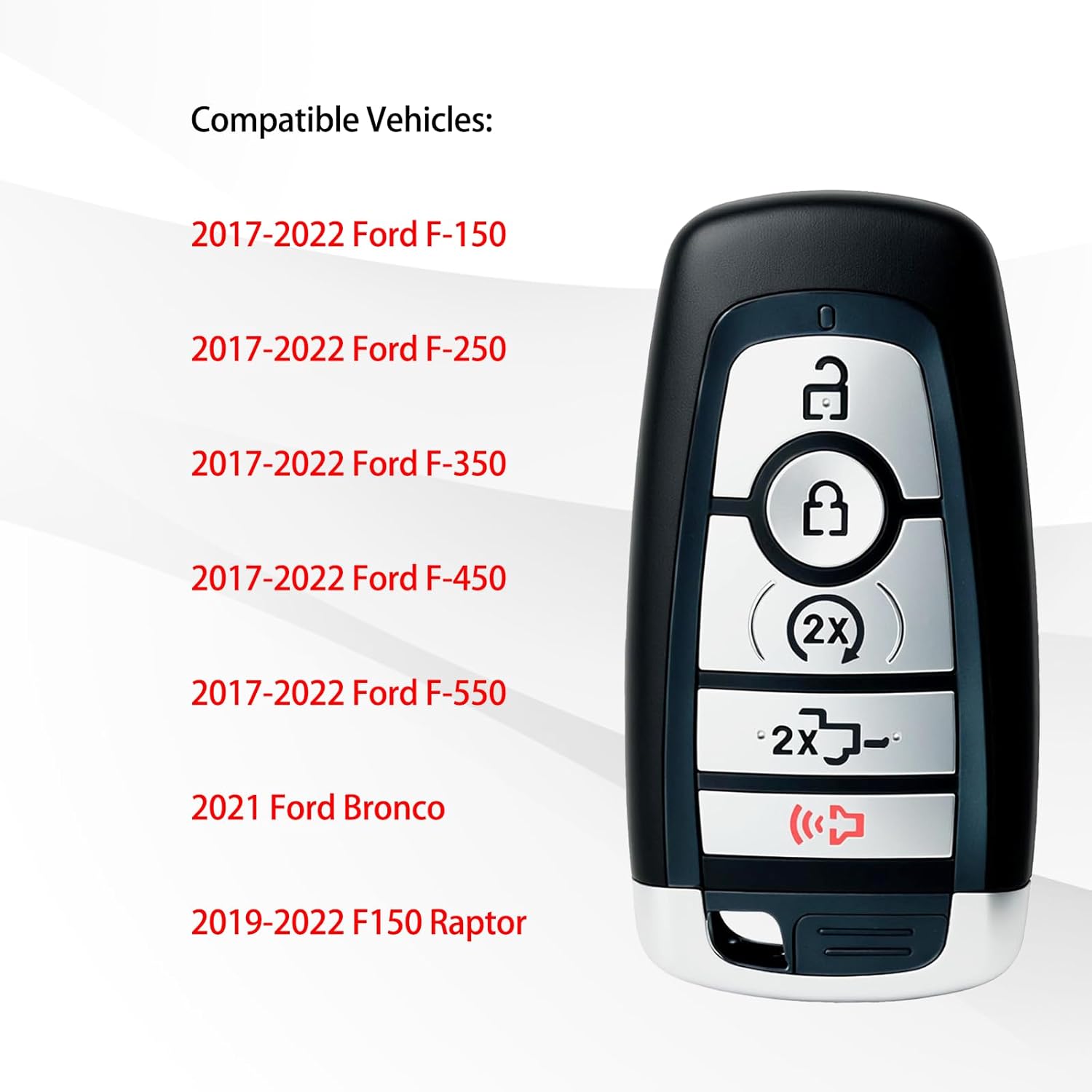 Chaveiro inteligente de entrada sem chave e partida remota, compatível com Ford F-150, F-250, F-350, F-450, F-550 (2017-2022) e Ford Bronco (2021). Este controle remoto oferece conveniência e segurança, permitindo acesso fácil ao veículo sem a necessidade de chave física. Possui design ergonômico e funcionalidade de partida remota, ideal para aquecer o motor antes de entrar. Substituição perfeita para chaves danificadas ou perdidas, com compatibilidade garantida (FCC: M3N-A2C93142600).
