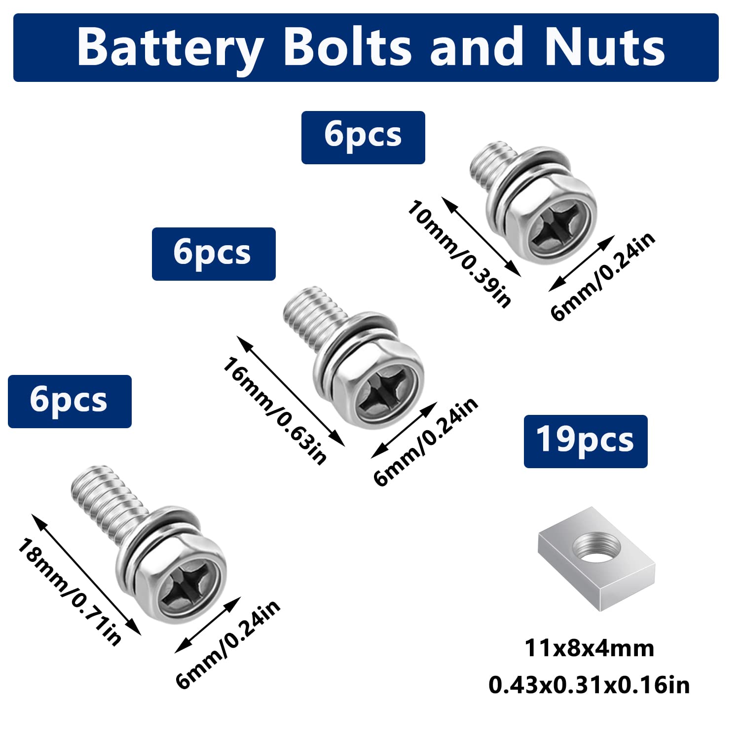 Embalagem: O kit contém 18 parafusos quadrados para baterias de motocicleta e 19 porcas quadradas, oferecendo uma quantidade suficiente para múltiplas aplicações.