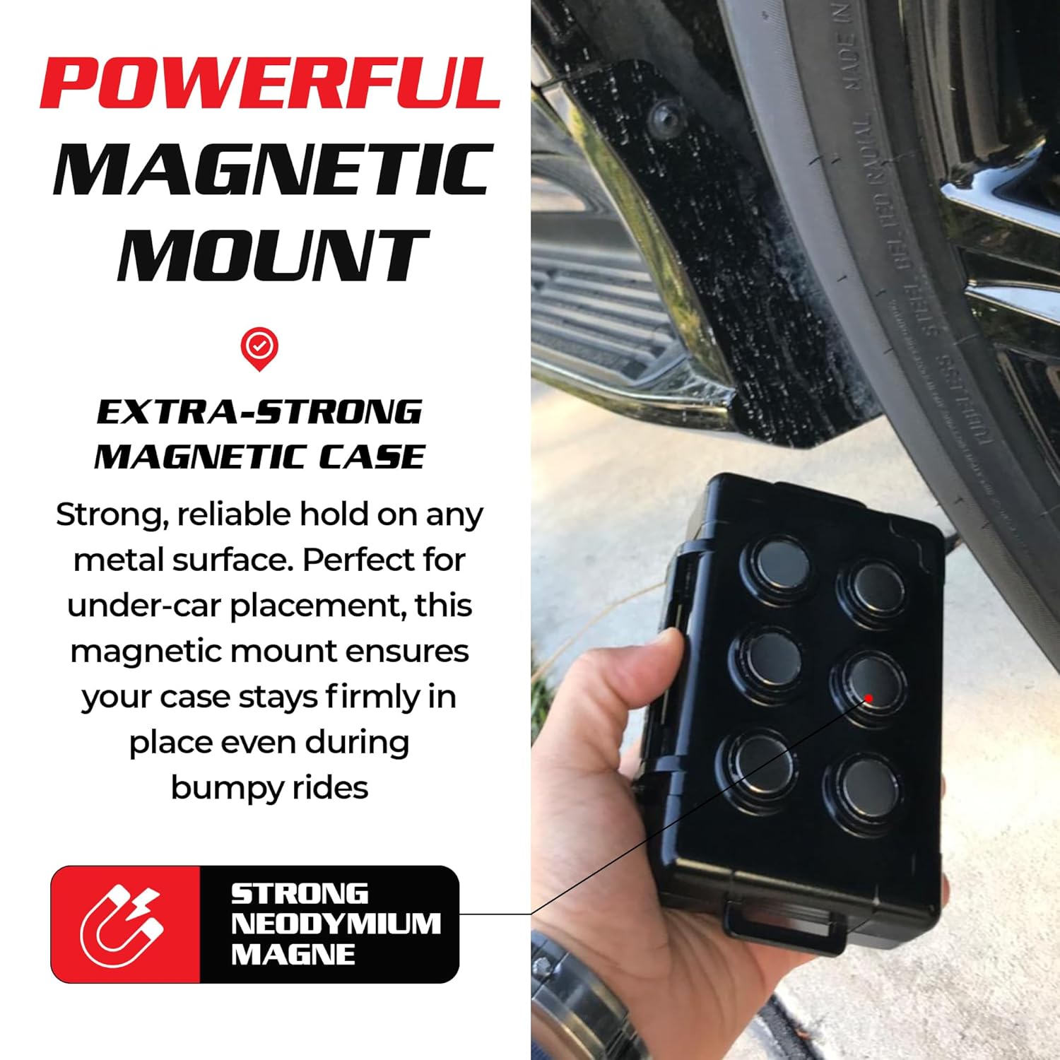 - Suporte magnético para instalação sob o carro – Equipado com dois potentes ímãs de neodímio, este case pode ser facilmente fixado na parte inferior de um veículo ou em qualquer superfície metálica.