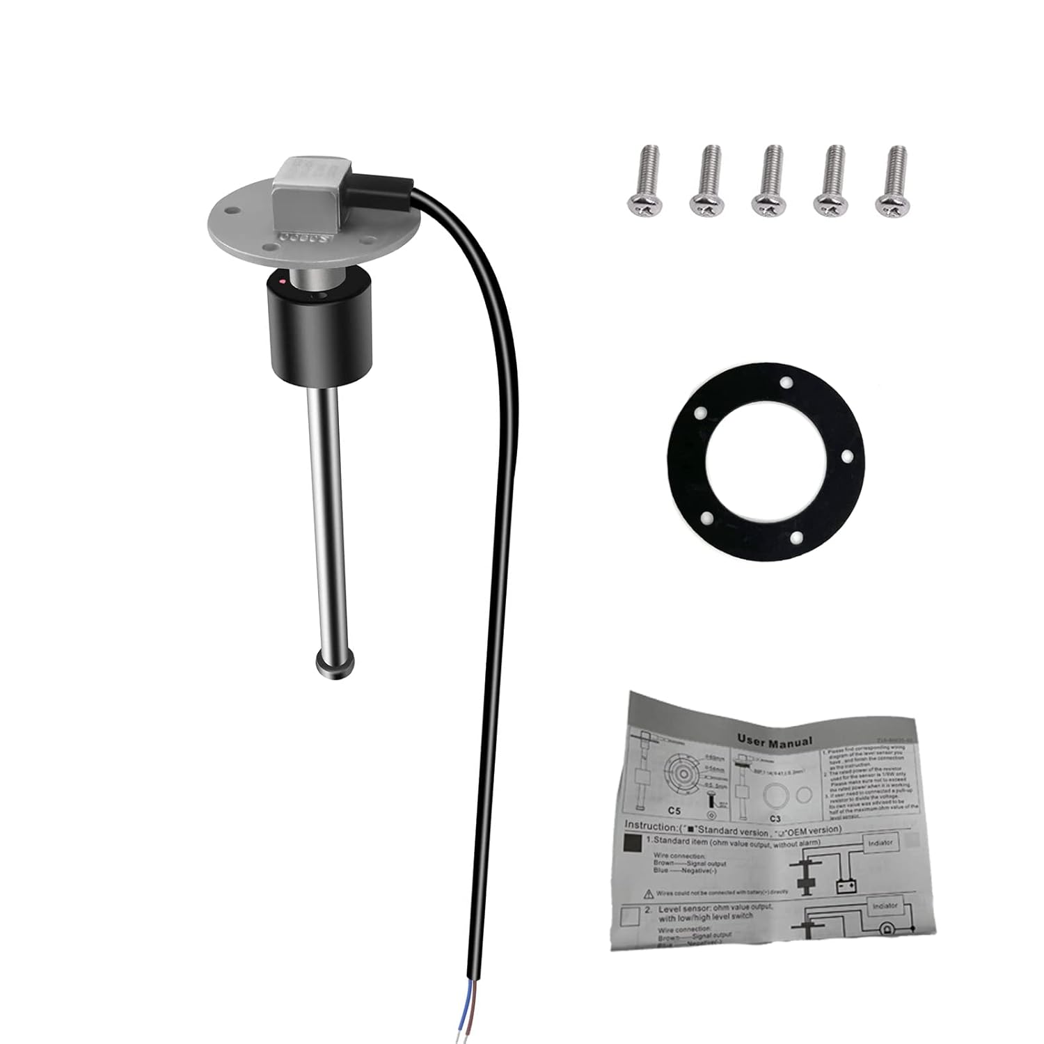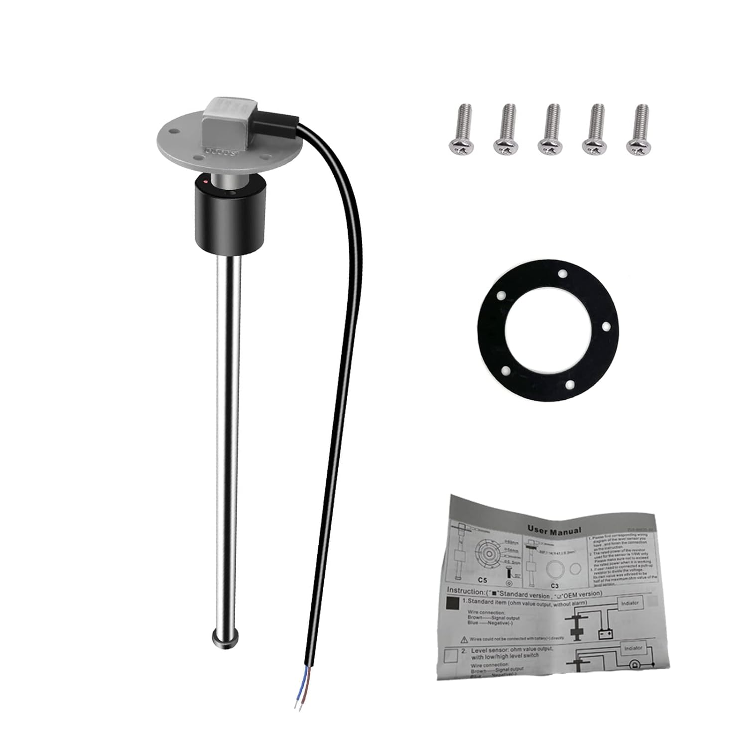 This level sender worked perfectly. The sender in my skid loader failed and they wanted over $200 for a new one. I just drilled a 1.5″ hole in the plastic and added this sender. Used wire crimps to connect wire to old sender wires. Well built, stainless steel.