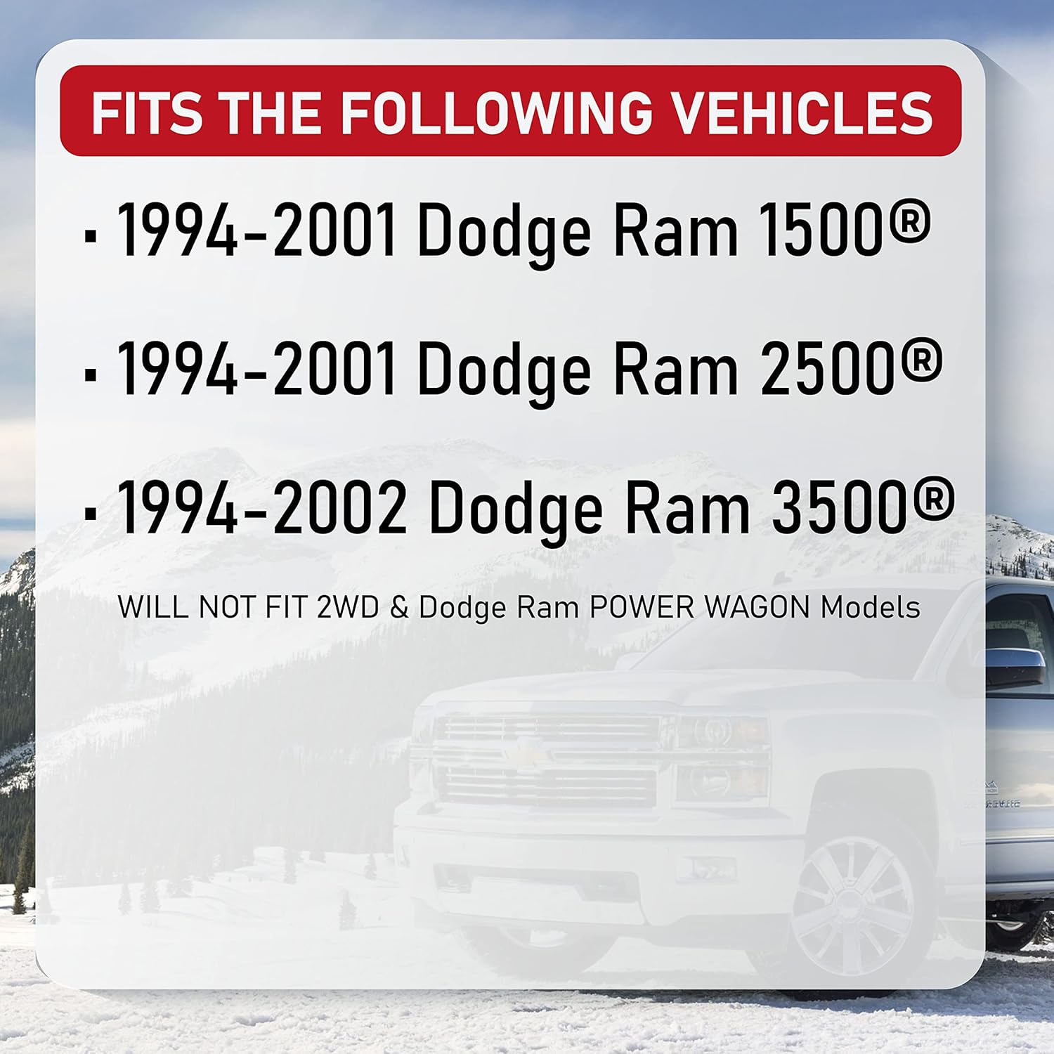– Compatibilidade: Projetado especificamente para Dodge Ram 1500 (1994-2001), Ram 2500 (1994-2002) e Ram 3500 (1994-2002). Não é compatível com modelos 2WD e Ram Power Wagon.