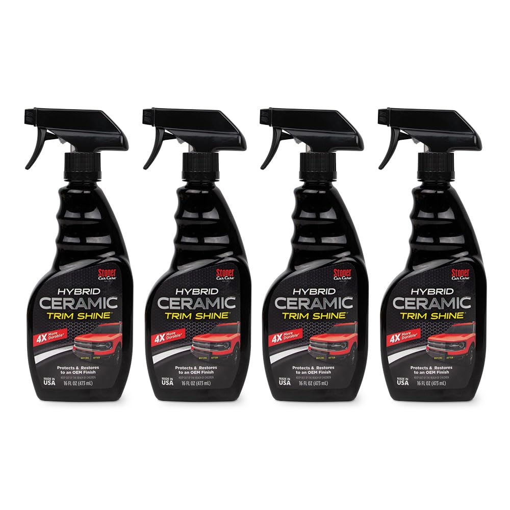 Stoner Hybrid Ceramic Trim Shine Protectant and Restore is very easy to apply. For large surfaces spray directly then spread using microfiber cloth, for smaller/tighter areas I sprayed solution on 3″x3″ gauze pads and applied. Result was immediate return of trim to original black with subdued sheen. I used to restore interior/exterior trim a on 2015 F150 and 5 year old soft tonneau cover. All look as good as new and it may be my imagination but tonneau cover appears to have tightened. We’ll see how it holds up but if necessary reapplying every few months is no issue to me as its so easy and economical.