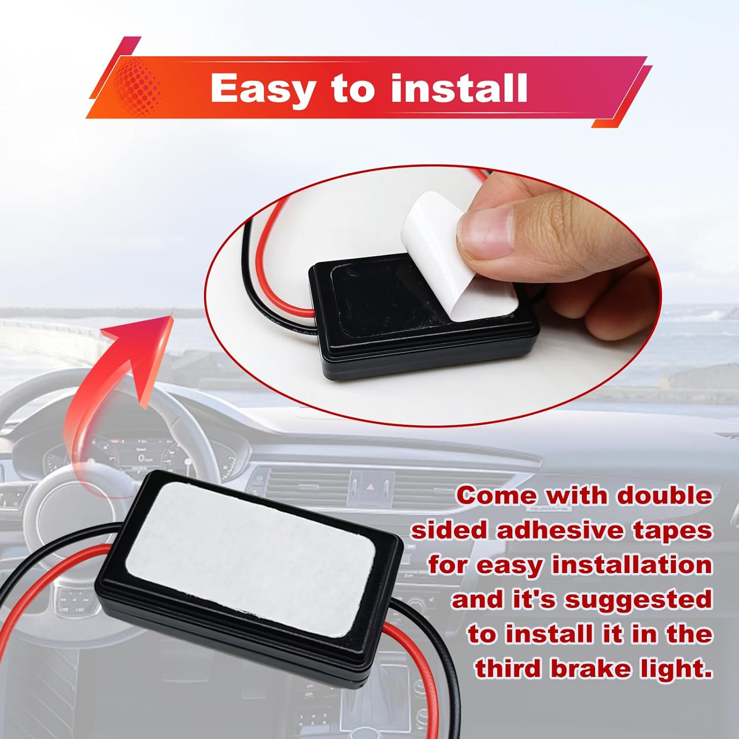A instalação do Strobe Brake Light é simples e prática. O módulo possui fios de entrada e saída, onde o fio preto deve ser conectado ao polo negativo e o fio vermelho ao polo positivo. É recomendado instalar o dispositivo na terceira luz de freio, sendo compatível com todos os tipos de luzes de freio LED. Cada pacote inclui 2 controladores de estroboscópio e 2 fitas adesivas de dupla face, facilitando ainda mais a instalação.