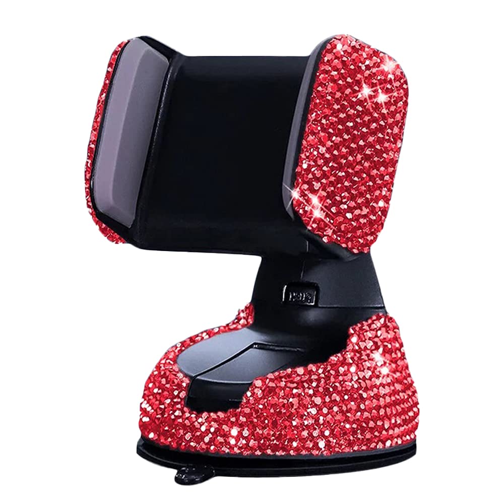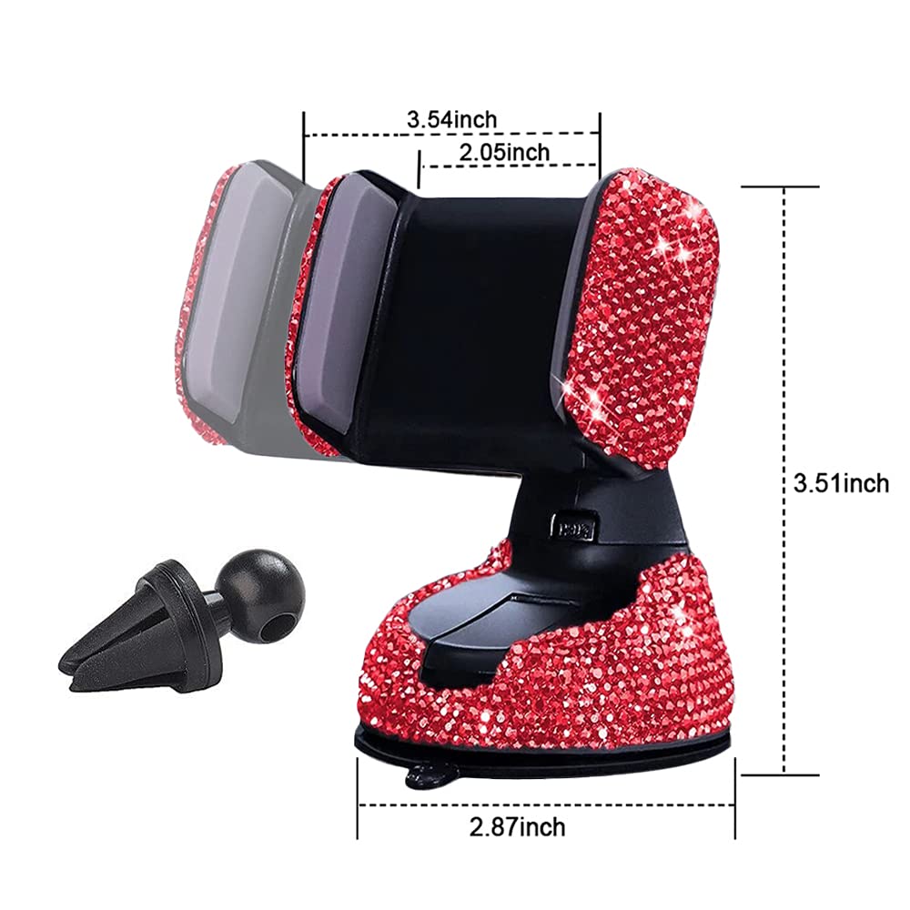 I do NOT advise you to buy this product! This item was used once. It was purchased as a gift to my wife. It came out of the bag with one of the bling detached from one side of the phone clamp (red arrows). I glued it on. My wife used this phone holder once, and the other side of the phone clamp bling fell off. Also, the larger bling ring around the base fell off. Also, the top section detached from the base (blue arrows) WHILE using it to hold her phone to the windshield, on it’s first use! Cheap quality. VERY DISAPPOINTED!